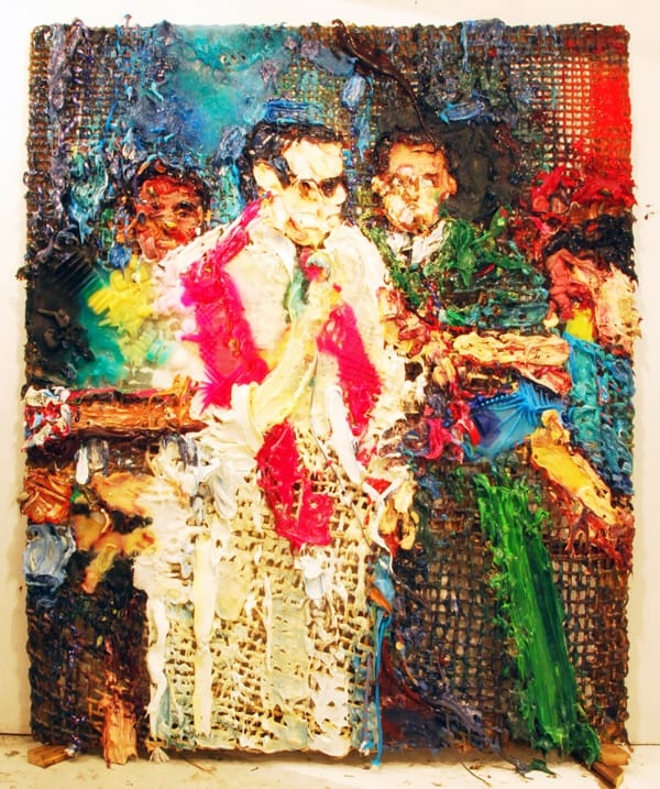 At one point, I blurted, “These are zombies.” If painting isn’t dead and it isn’t alive, perhaps, I reasoned, it is a zombie, one of the living dead ravenous with hunger. Like the mass media, it wants to devour the world. The mass media turns everything into an image, a bodiless presence. Marcaccio, on the other hand, restores the pierced, burnt and eviscerated bodies. He focuses our attention on the unbridled mutations informing everyday life. There is the weird warp of his images sliding into a creepy physicality. The silicone doesn’t decay, but it embodies its degradation.