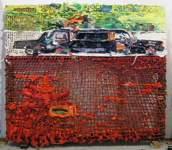 If he wants, Marcaccio can have the weave echo the perspective lines used in the floor patterns of Renaissance paintings, as he does in “Limo” (2011-2012). Or he can interrupt the natural manila-colored weave by introducing colored climbing rope. Waiting to be worked on,