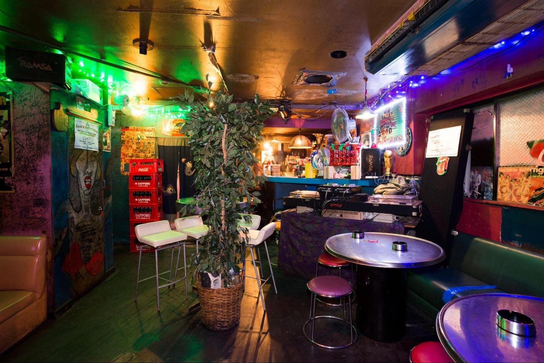 Many queer spaces are formed by the need for safety from homophobic violence. New Sazae is a pocket-sized bar in Tokyo, tucked away out of sight on the second floor of a mixed-use zakkyo building. Bars in the queer Shinjuku Ni-chome neighborhood were often investigated by police enforcing Public Morals Regulation law, or fūeihō, in postwar Japan. As contributor Takeshi Dylan Sadachi writes, walls adorned with graffiti, glossy fake plants, and a mirror ball make the hidden space a final “bastion of disco culture in Tokyo.”