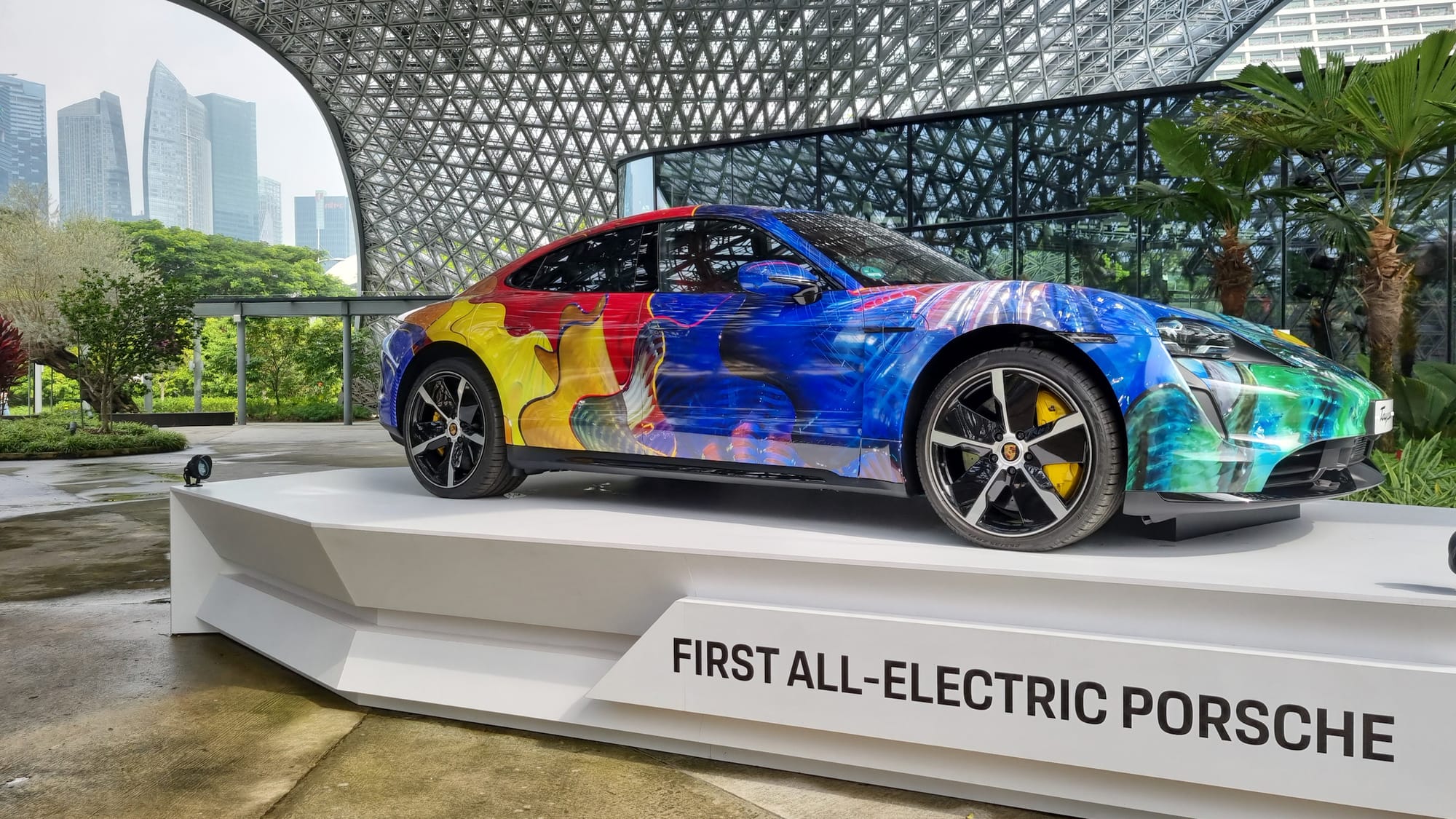 Make no mistake about it: besides being a temporary escape into fantastical shapes and colors, the Chihuly exhibition is an extension of US-Singapore diplomacy, alongside special free trade agreement visas and the 2019 15-year renewal of a US-Singapore agreement for US access to Singapore’s air and naval bases. With Singapore’s growing anxiety over being caught between US-China tensions, Chihuly’s colorful, lively, totally breakable sculptures inevitably reflect an uneasy peace, one where access to Western art and commerce could be denied to us just as easily as it was granted. In the meantime, what better way to celebrate our cosmopolitan status than through strategic corporate partnerships? Halfway through my stroll I came face-to-face with a Porsche Taycan displayed on a pedestal, painted with the shapes and colors of Chihuly’s “End of the Day Persian Chandelier” (2015). It was a puzzling collaboration drawing parallels between Chihuly’s innovations in glassblowing and Porsche’s innovations in car making.