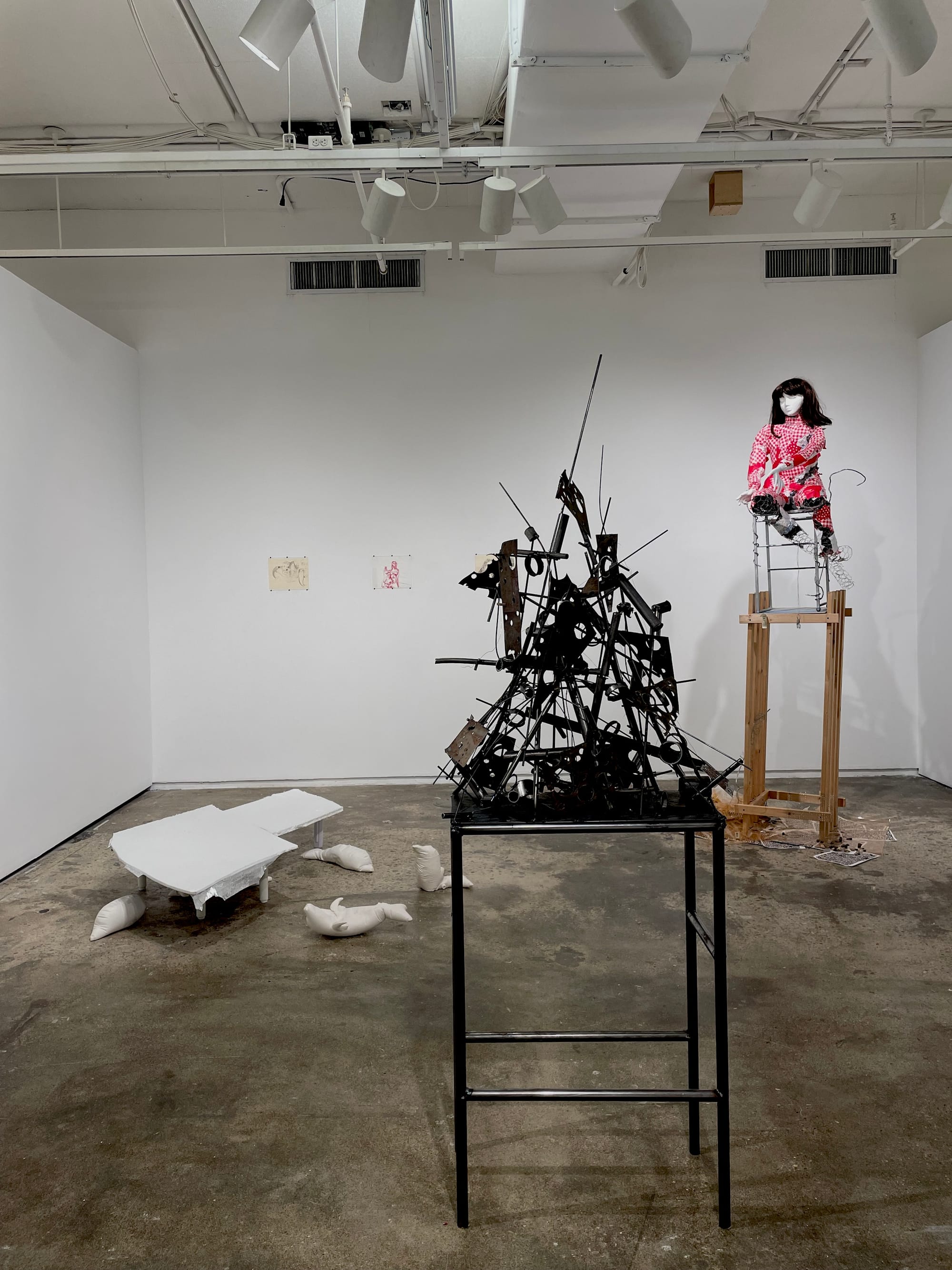 Nearby are works by sculptor Chloé Wilcox, who combines a fascination with dolphins with intricate skills across various mediums, resulting in scenes that are both wondrous and filled with humor. A papier-mâché mannequin leans forward as if mid-sway, while a pod of smaller cement-filled dolphin toys can be found swimming around and underneath a makeshift cove created out of styrofoam. Opposite the mannequin, a dolphin’s head created out of a mop covered in rubber seems to poke out from the gallery floor, welcoming us to step into Wilcox’s world where, like her peers, she has no choice but to make art.