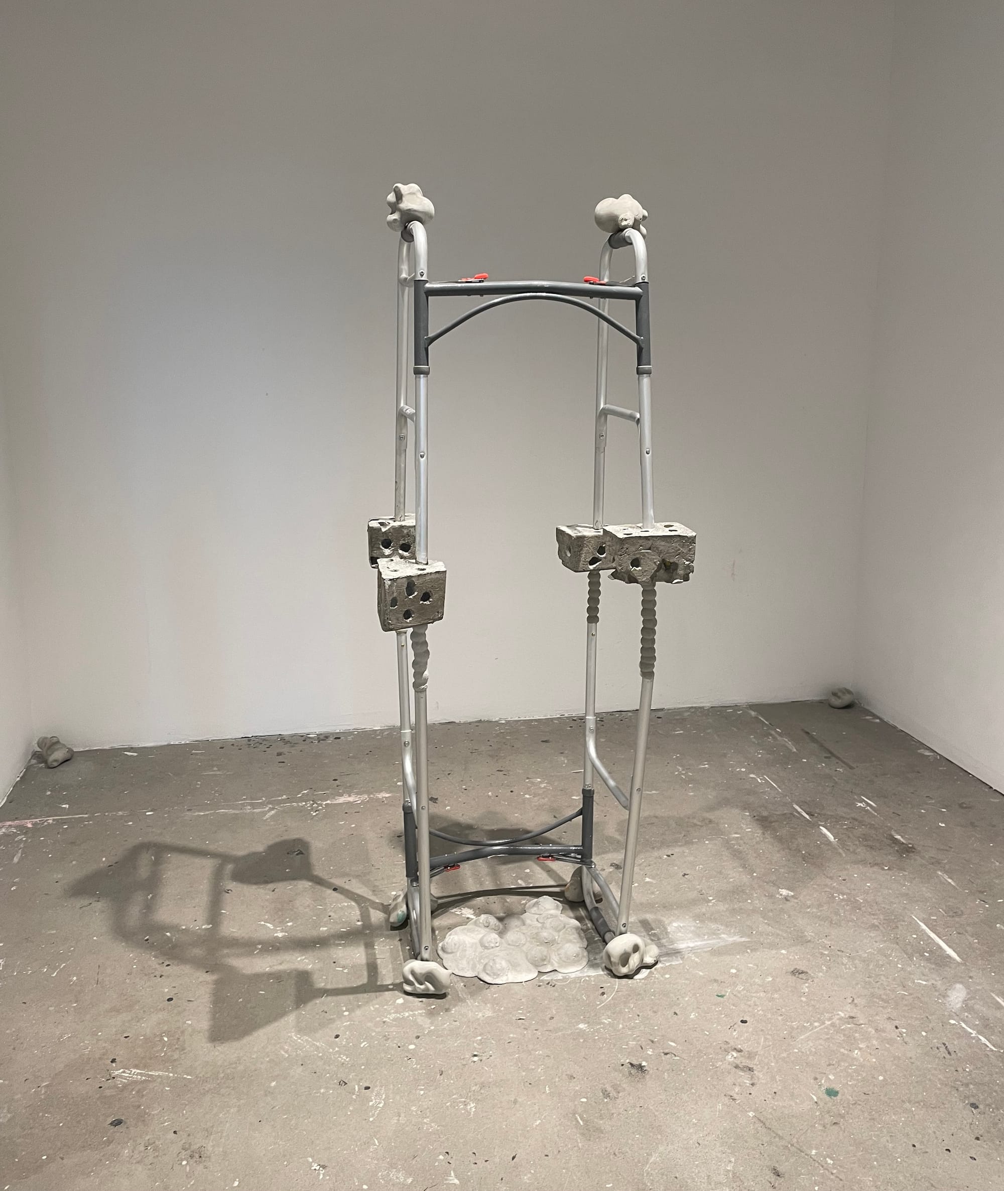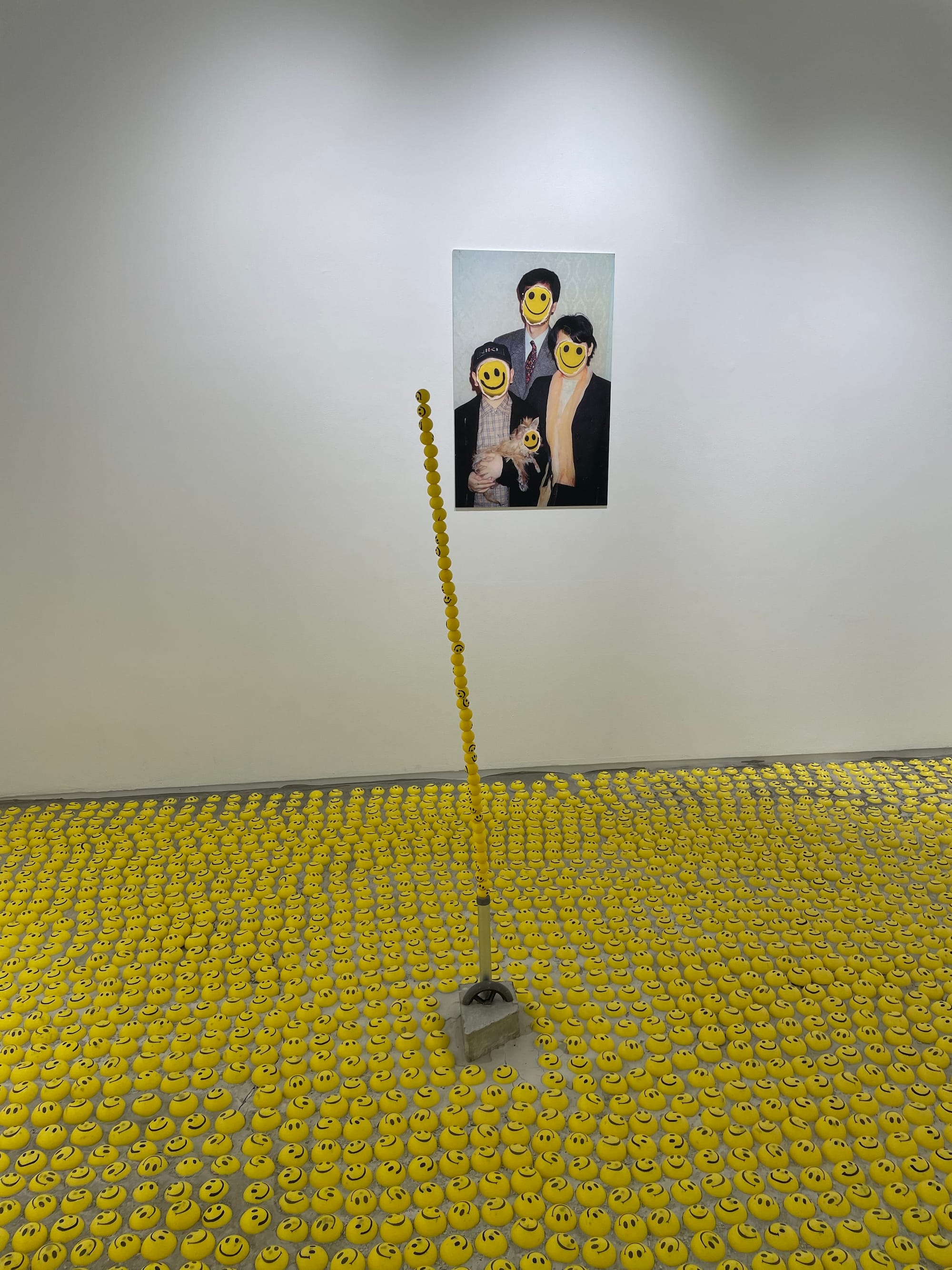 In an adjoining installation, “One For You and One For Me,” the artist references his own mortality through two stacked metal walkers, one of which was his father’s and the other reserved for his future self: Given that his family has a history of strokes, perhaps he is next. Kim paradoxically infuses the installation with a sense of playfulness through the whimsical stress balls and unconventional artistic mediums, such as cement-filled condom sculptures, offering visitors a surprisingly joyful and engaging experience despite its somber core.
