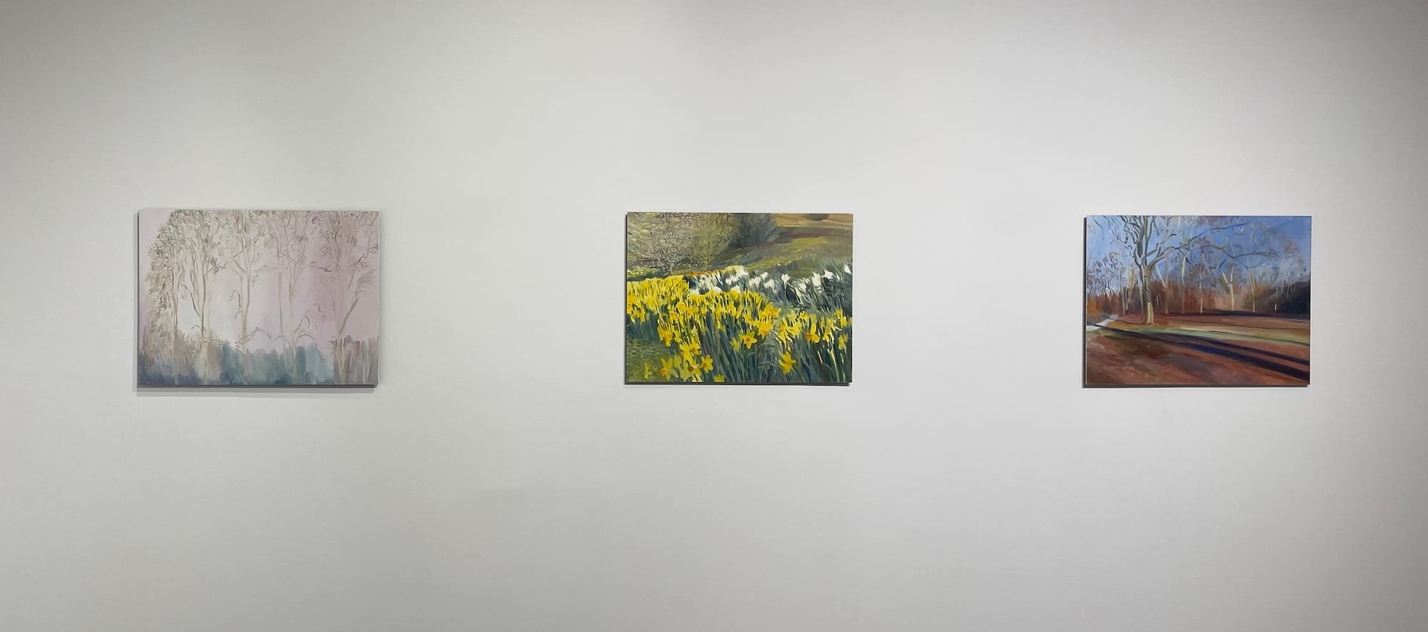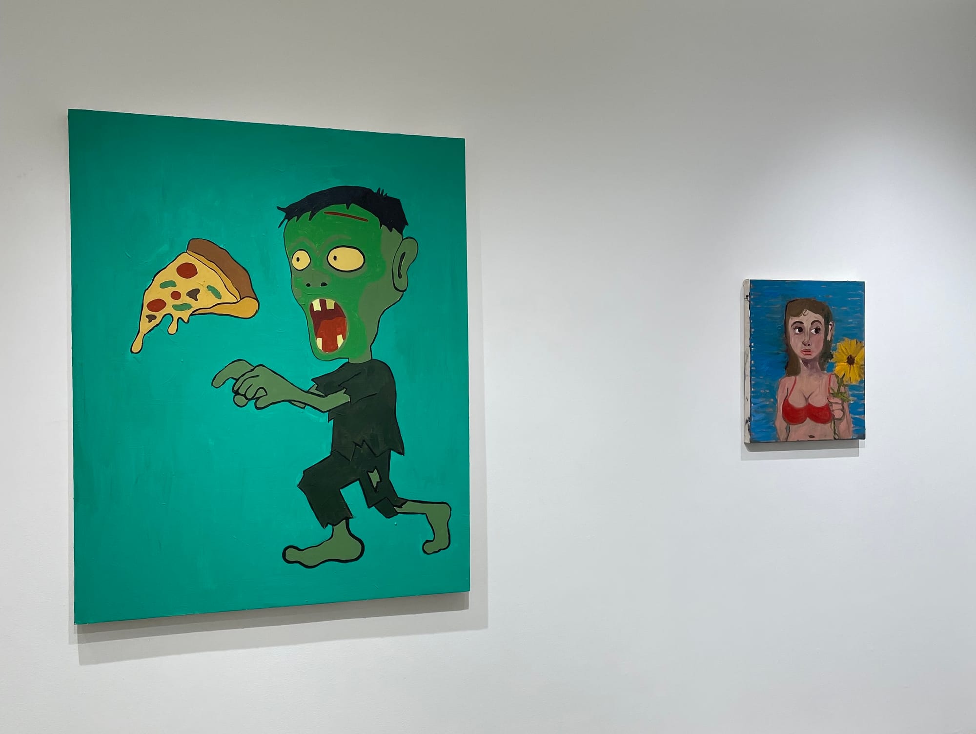 Rounding out the exhibition on the second floor are works by Ryan Johnson, Jacob Lay, and Chloé Wilcox. Johnson’s plein-air paintings ask and answer the question of what it means to paint a landscape in our current moment. In this series, Johnson painted on-site around New York City, in his studio, and in nature, reflecting on the broader changing of the seasons and how to paint a slowly disappearing light source. Jacob Lay’s paintings and drawings in an adjoining room are inherently individual in their visual jumps in style but steeped in art historical references to portraiture, depictions of nude women, and cartoons. On one wall hang two nearly identical female nude portraits. Both women stare up at the viewer, each holding up a glass of wine filled to the brim as if they are toasting to us. Next to these works, quite unsettlingly, we’re met with a larger canvas that depicts a cartoon zombie chasing after a slice of greasy pizza. In both sets of works, Lay attempts to balance the uncanny and the historical with the medium of painting.