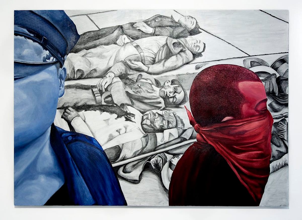 Neither a US state nor entirely self-governing, Puerto Rico remains an “unincorporated territory,” a cruel turn of phrase that brings to mind unmoored, floating land masses. It is both “owned by the United States” and “foreign to the United States,” in the exact words of the 1901 Supreme Court ruling on the island’s territorial status. In this strange limbo, Puerto Ricans can be drafted into the military but can’t vote for a US president; wealthy Americans arrive in throngs to reap the benefits of a looser tax policy, but amid widespread poverty, Puerto Ricans cannot fall back on forms of federal assistance reserved for those in the 50 states. The same provision that allowed American subsidiaries to operate tax-free for years, Section 936 of the Internal Revenue Code, devastated Puerto Rico when its dissolution in 1996 left a lacuna in the island’s manufacturing sector that was quickly filled up with debt. In works such as Brooklyn native Danielle De Jesus’s layered painting “Google the Ponce Massacre” (2021), which bridges historical and contemporary activism, we are reminded that Puerto Rico's past is very much in the present, and that its current strifes cannot be separated from its colonial condition.