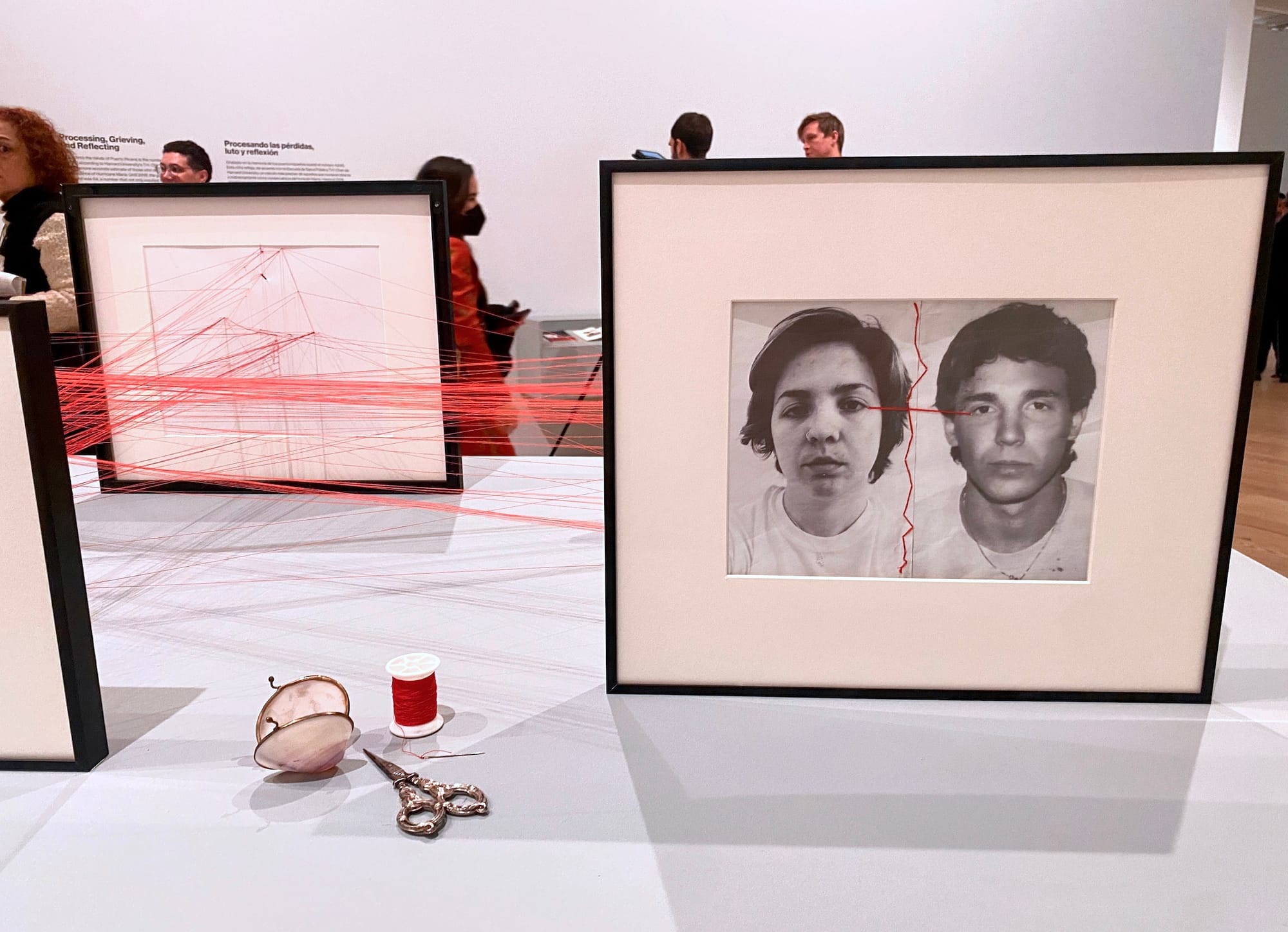 The exhibition is loosely organized into four sections centered on physical infrastructure, political protest, grief and loss, and the environment. As in the real world, though, no formal boundaries separate them; rather, they bleed into each other in a dizzy, inescapable continuum. Yiyo Tirado Rivera’s “La Concha” (2022), from his series of sandcastles of iconic modernist hotels, recreates a tropicalia relic. The sculpture is meant to gradually collapse into a pile of sand during the run of the show, invoking the hazards of coastal erosion as well as the tenuous mirage of the Caribbean’s tourism sector. Gabriella N. Báez’s “Ojalá nos encontremos en el mar” (“Hopefully We’ll Meet at Sea)” (2018–), a stirring installation of threaded photographs connecting the artist and her father, who died by suicide in 2018, is a gesture of remembrance as well as an act of resistance against a state that left vulnerable individuals to fend for themselves in the wake of the storm.