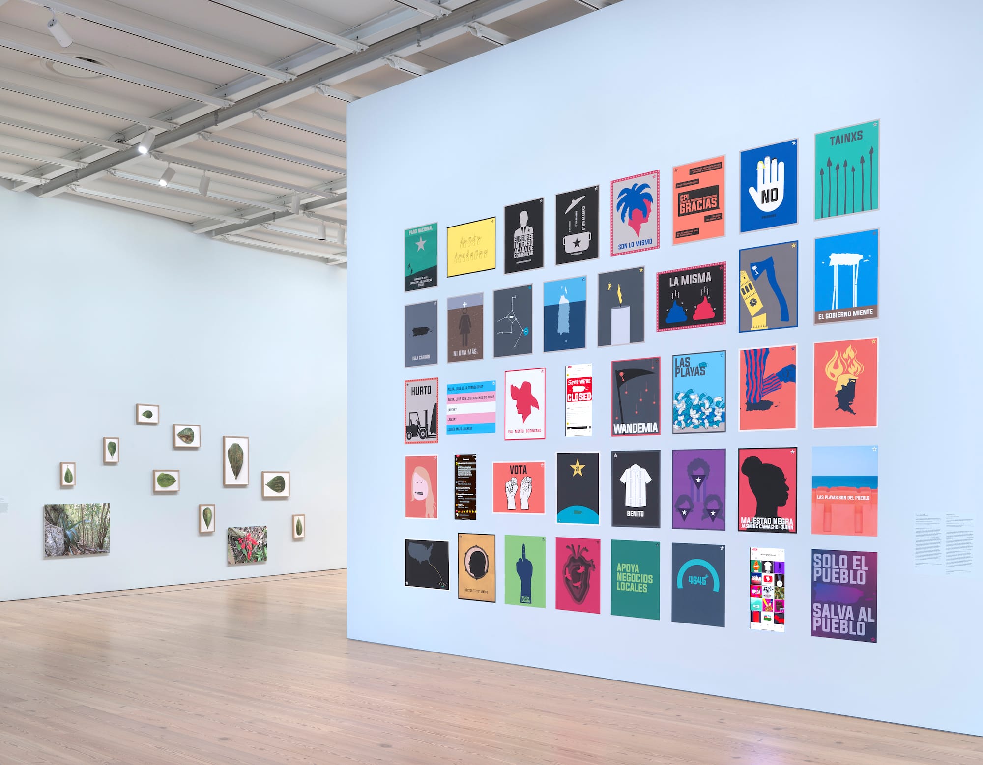 Depending on where you start, the exhibition either ends or begins on a note of uprising. The months and years after Maria brought renewed waves of activism to the island, the pinnacle of which was arguably the 2019 ouster of Governor Ricardo Rosselló. The politician's self-dealings and hateful diatribes embodied everything many Puerto Ricans were ready to leave behind: widespread corruption, anti-Black sentiment, homophobia, and the marginalization of victims hardest hit by the storm. Designer Garvin Sierra Vega chronicled the emergence of dissident messages during this period on his popular Instagram account @tallergraficopr. A series of 38 printed posters take up a wall at the Whitney, including one depicting a silhouette of the news anchor who uttered the emblematic words "El perreo intenso acaba de comenzar" — "The intense perreo has just begun" — when LGBTQ+ activists danced in protest outside the San Juan Cathedral near the governor's home.