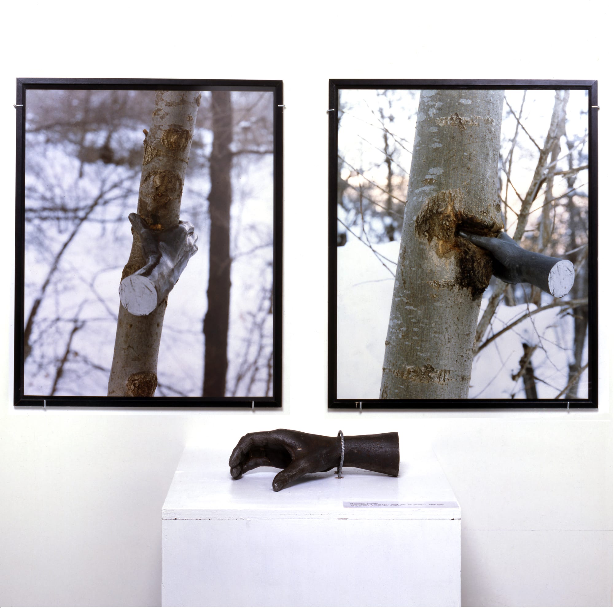 Nearby, two groupings of artworks look back to the early days of conceptual nature-artist interactions, starting with Turin-based Giuseppe Penone, who in the 1960s famously placed a bronze cast of his own hand into an ash tree; over the years, the tree grew around the intervention, which he titled “Continuerà a crescere tranne che in quel punto” or “It Will Continue to Grow Except at That Point” (1968–2003). In this show we see a similar piece with a walnut tree. Seminal land artist Agnes Denes also makes an appearance, with photographs of trees chained together (part of the “Rice/Tree/Burial” project she executed for decades, beginning in the 1970s) as well as documentation of her classic reforestation project “Tree Mountain: A Living Capsule,” started in 1982. For this work, 11,000 individuals each planted a tree in a spiral formation on a manmade mountain in Finland.