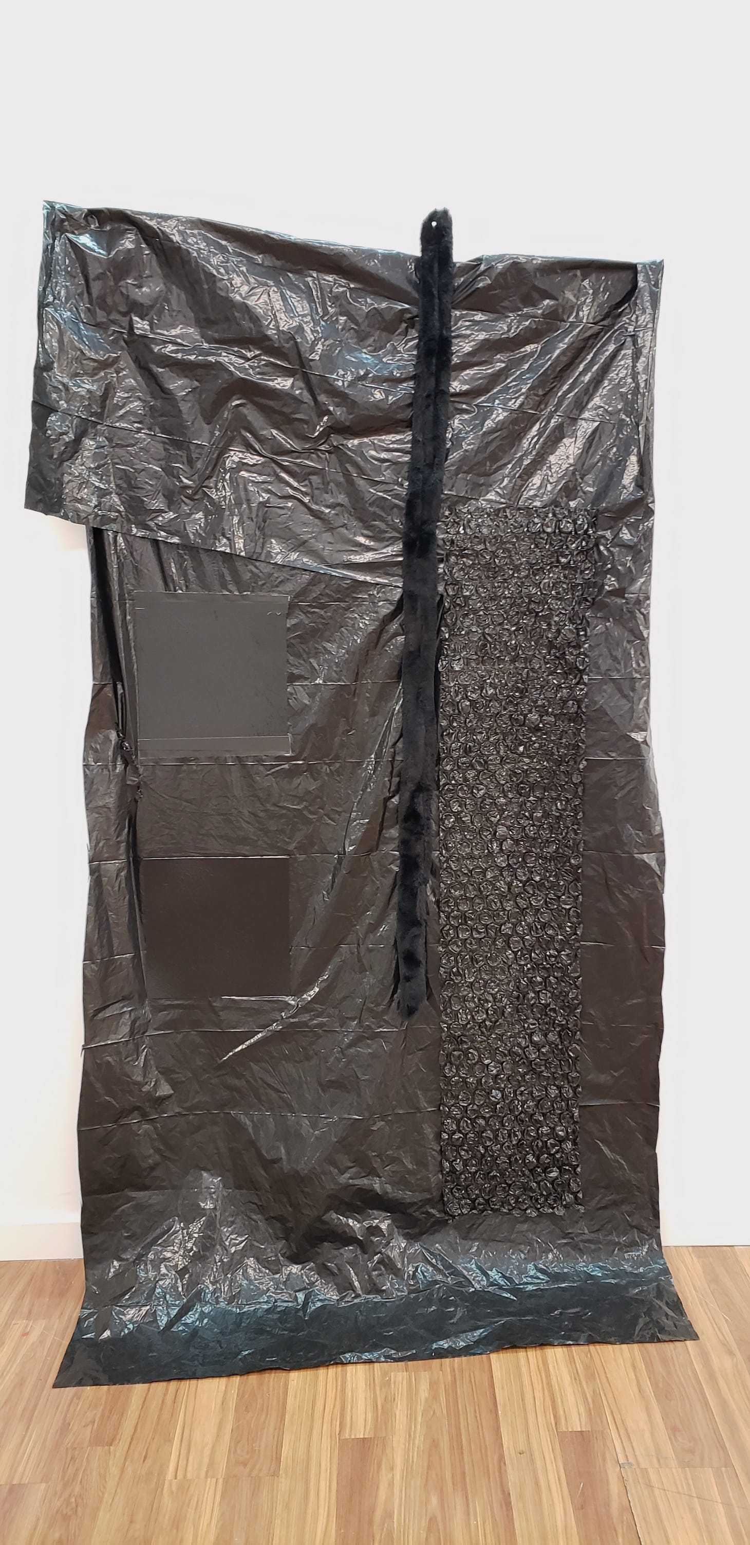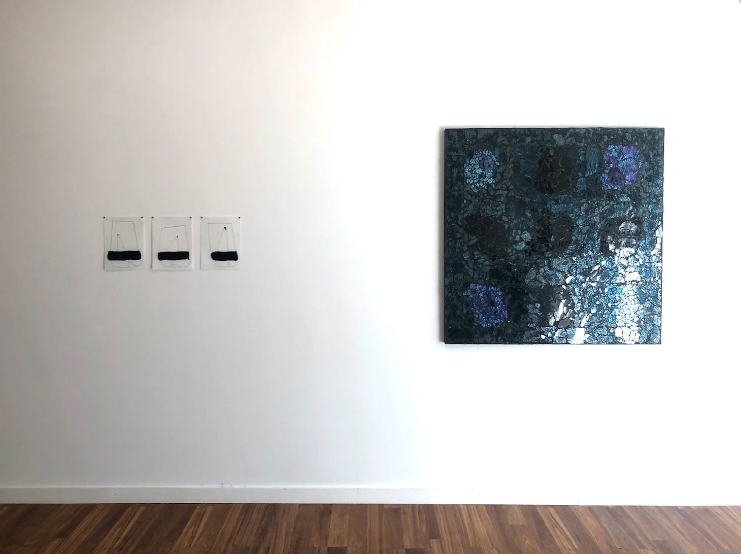 Alternatively, A Muffled Sound Underwater is thematically arranged around the idea of blackness as a metaphor — for failure, a void, a sense of loss, or, more positively, for beginning. The arrangement of the pieces sit tighter, gathered in a long hall where Makonnen’s centrally placed “The Astral Sea” (2019) is surrounded by other works curled around the periphery. The show plays with the intersection of Blackness, as in the ethnic identity of all the artists, and elements that are darkly pigmented. It revolves around the theme of blackness (perhaps Blackness too?) as a needed, primary substrate on which or out of which objects of ceremonial and cultural significance, like Makonnen’s long, elaborate hieratic robe can be fashioned.