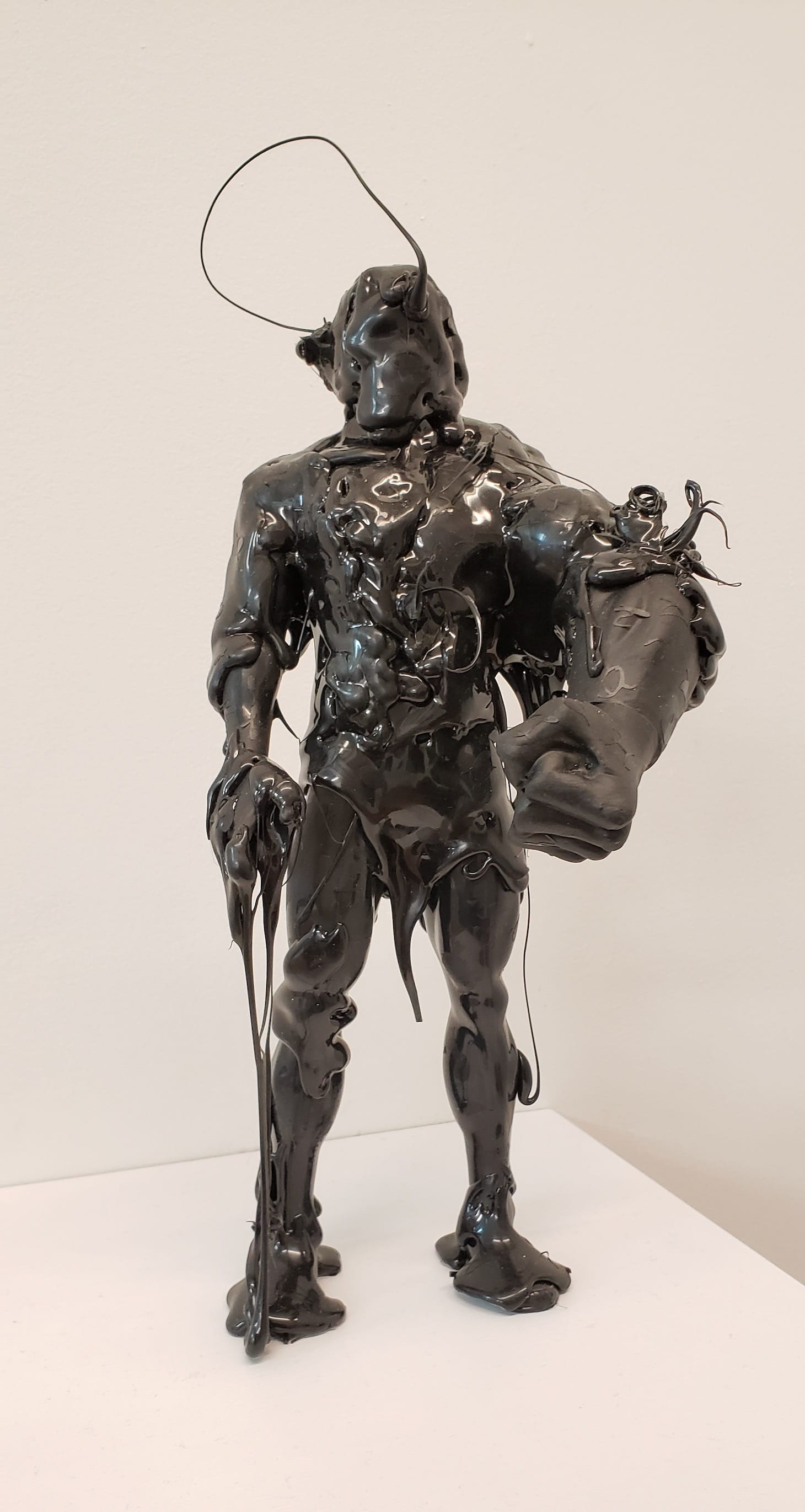 Identity and material run on parallel tracks that are coerced into intersecting to yield the very textured, hybrid, abstract pieces by Duroseau which are made of distinct materials brought together under the cloak of night. Shiferaw makes his painted abstraction rigorously disciplined on the surface but uses his titles, for example “Simply Falling (Lyeoka)” (2019-2020), to refer to a network of Black cultural production. Marvin Touré’s partially melted toy pieces, such as “Super Sad” (2019-2020), evoke the abject nature of a masculinist power ideal that is often associated with Blackness. And Gumby’s acrylic and glass assemblage “You think dark is just one color, but it ain’t” (2020) makes black act as the launchpad for his continuing explorations of colors in combination. Here, excellence feels like an internalized ambition, a desire to investigate, which drives these artists to find out how materials might bridge the conceptual gap between Blackness and blackness — the notion of excellence as a guide rather than a hashtag. The show is superb in its intellectual curiosity, rather than in its advertising acumen.