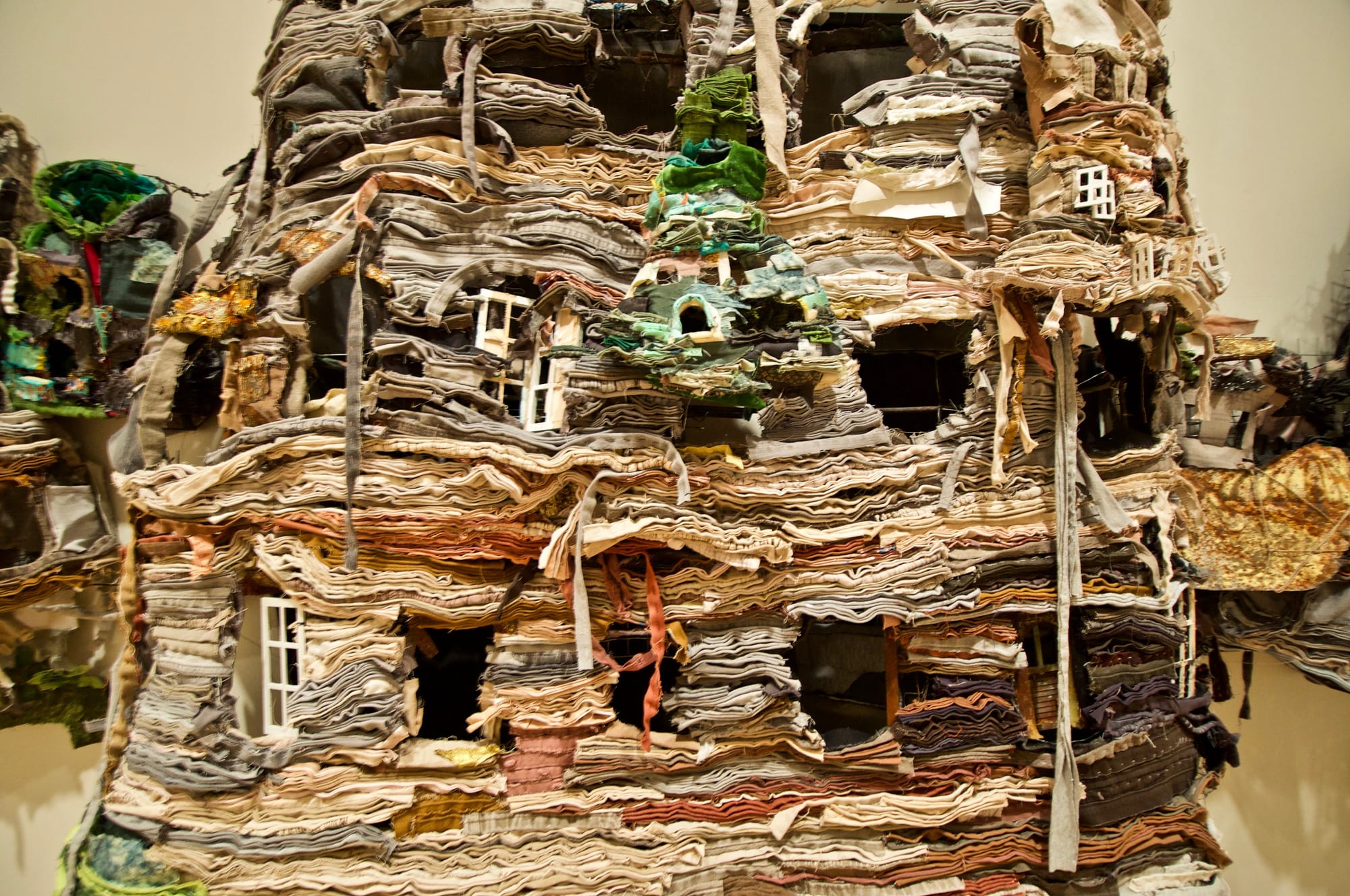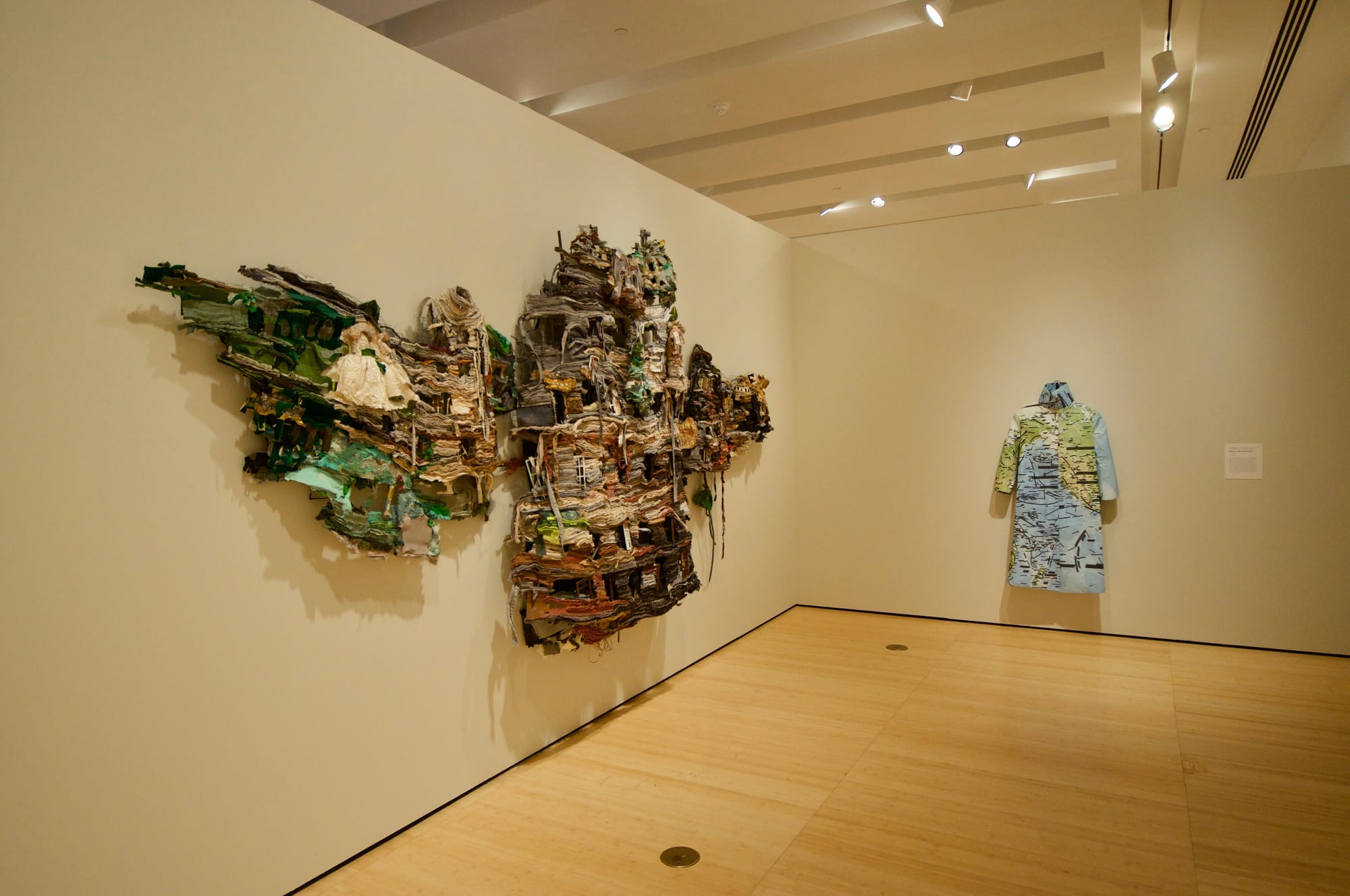 Ruby Chishti’s “The Present is a Ruin Without the People” (2016) is a fascinating wall sculpture created out of recycled textiles, wire mesh, and other materials. It’s cobbled-together architectural forms resemble the hollowed out carcasses of small abandoned homes, but at this scale they look more like bird houses, suggesting their residents have all flown away.
