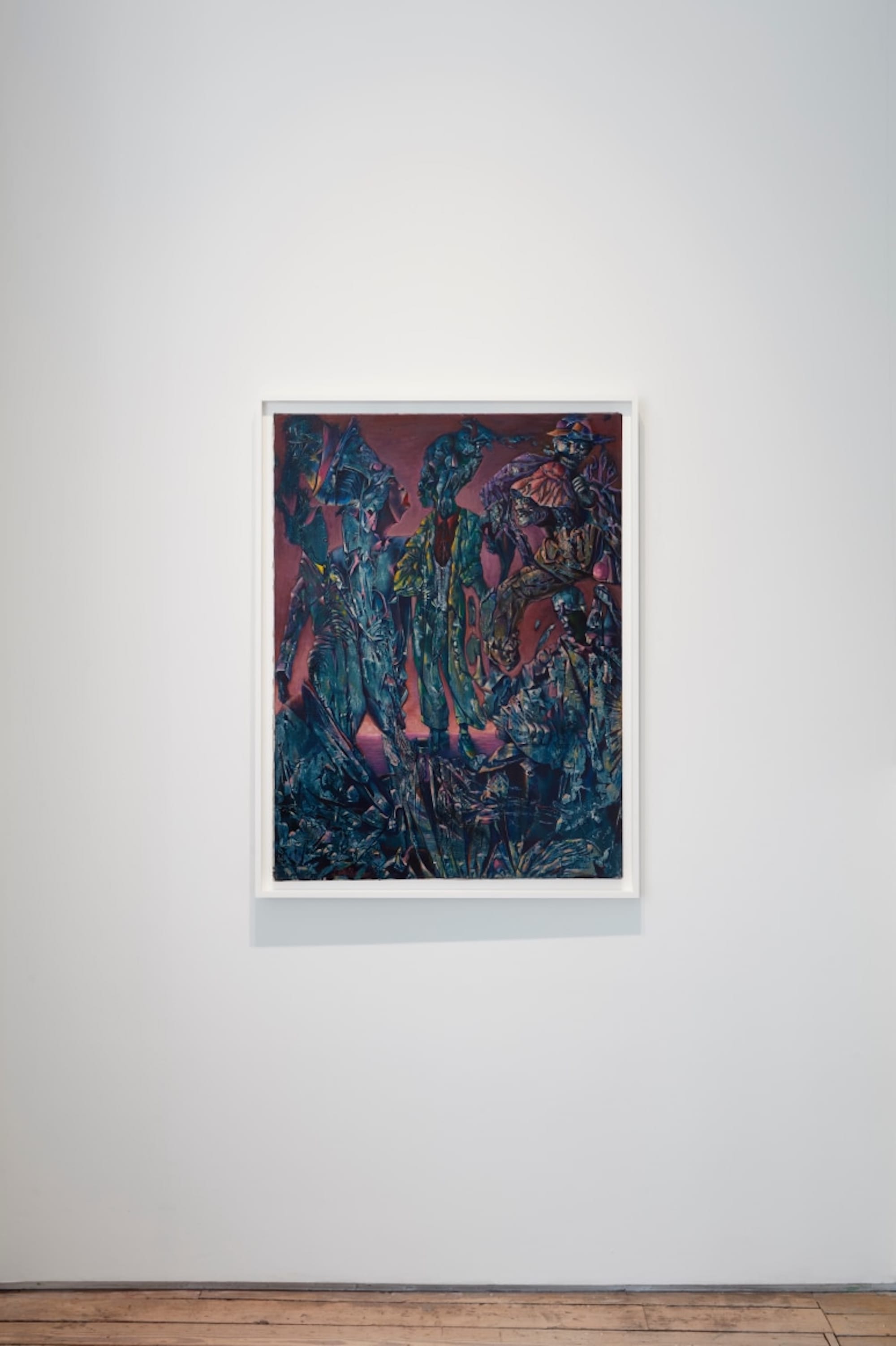 His images are fantastical and phantasmagoric and frequently combine the features of landscape, abstraction, and portraiture, but are unconcerned with being finely finished. The actual paint formula is unknown, but to my eye seems like a combination of oil intended for canvas, enamel, and perhaps house paint. Walker’s lack of care for painterly fine tuning is, of course, a hallmark of naïve painting, which has been of the moment for the last few decades. But too much of this work betrays artists’ desire to appear unbothered by artistic etiquette, while too little of it has paid attention to the meanings conveyed by marks. Walker, a Black, self-taught artist who died in 1993 after spending his professional life as a house painter, could have slotted into this zeitgeist easily, but he seemed to be after something else.