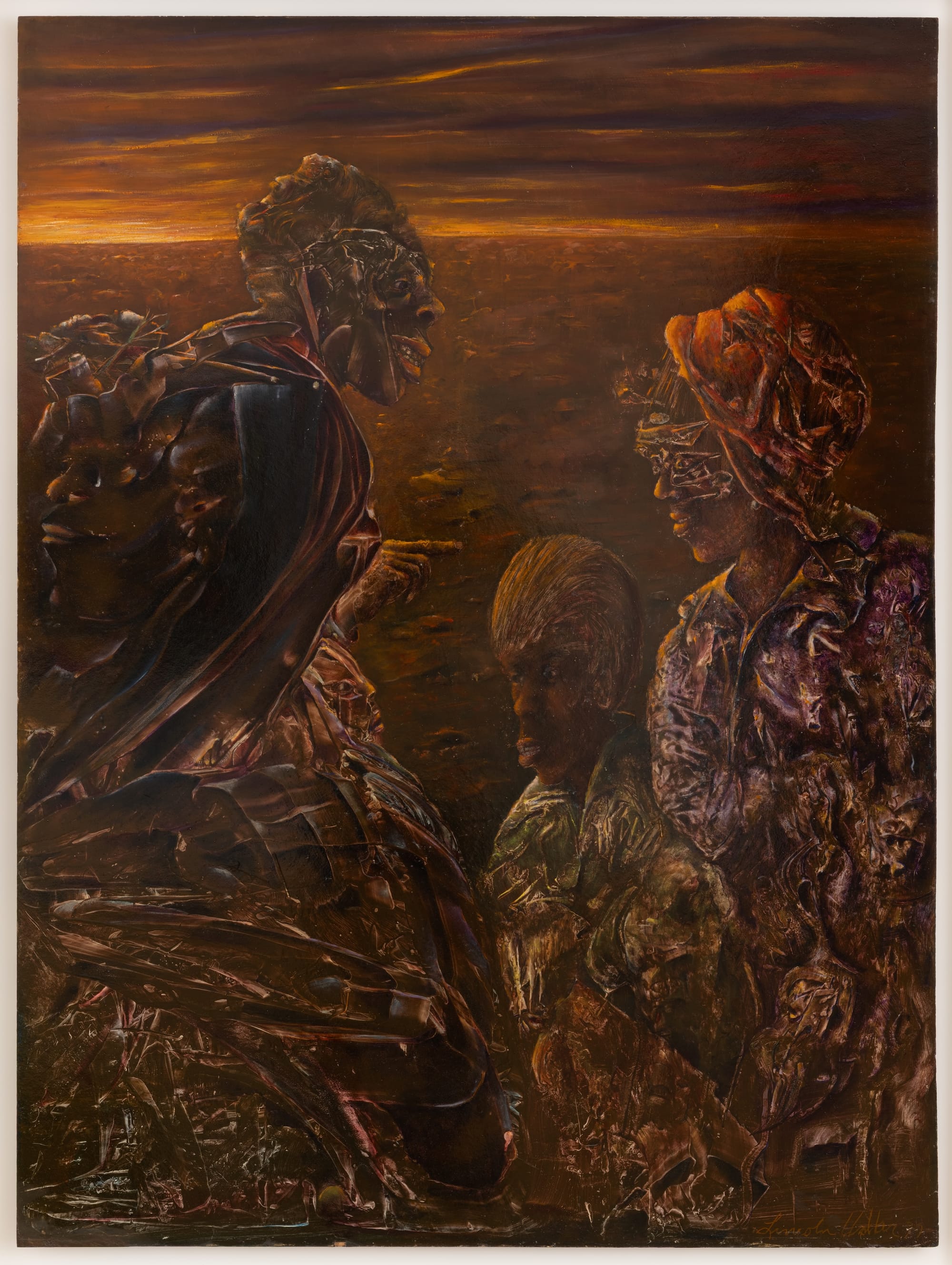 It's the energy between the figures in the majority of the compositions that is curious. Looking at “Widow’s Mite” (1977), there is again a comprehensive color scheme, this time brown with gold highlights. Three main figures occupy the foreground. A man who is elevated in the composition looks and points with the only hand that’s depicted at the face of a woman opposite him, but it’s not clear whether she returns that look, because her face is obscured by a smattering of abstract objects that cause her to appear unseeing. The figure set in the middle between them seems younger and male, and he gazes down and to the left of the painting at nothing identifiable, thus reading as if he is looking inward. A face is embedded in the space between the central adult male figure’s shoulder and back with their eyes closed, and another with their eyes downcast appears in the middle of the composition. In most of the other works in the show, except for those that are mostly abstract, there are a plethora of faces, some of which only emerge from the abstract gloaming after some time spent looking.