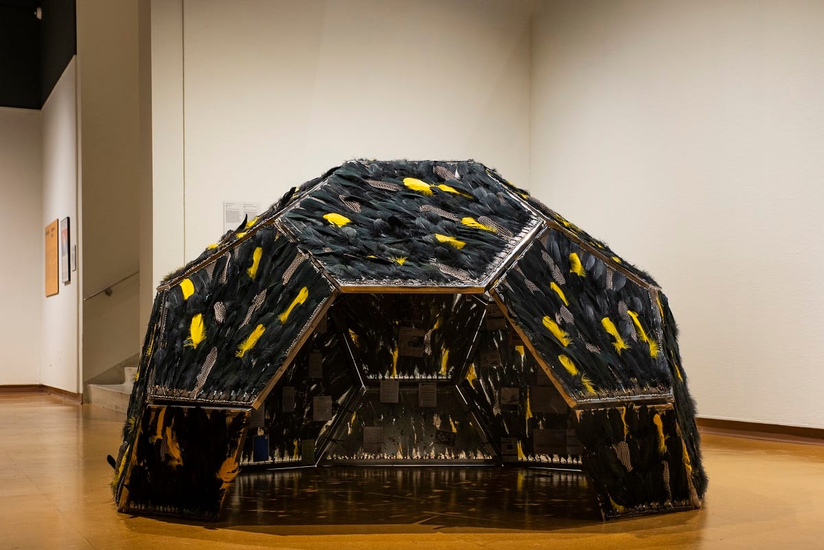 Similar in structure but conceptually contrasting is Beatriz Cortez’s “1984: Space-Time Capsule” (2021), a steel geodesic dome covered in black and yellow feathers. While Haacke’s recreation inspires fear, Cortez’s piece is inviting. Entering requires crawling on the ground through a low opening; being inside feels like hiding in a blanket fort. Hanging within the dome are miniature reproductions of ephemera once belonging to Coosje van Bruggen whose artistic and curatorial practices inspired the work. Cortez, who was just 13 years old in 1984, is originally from El Salvador and migrated to the United States in 1989. She collaborated with other immigrants to construct the “Capsule.”