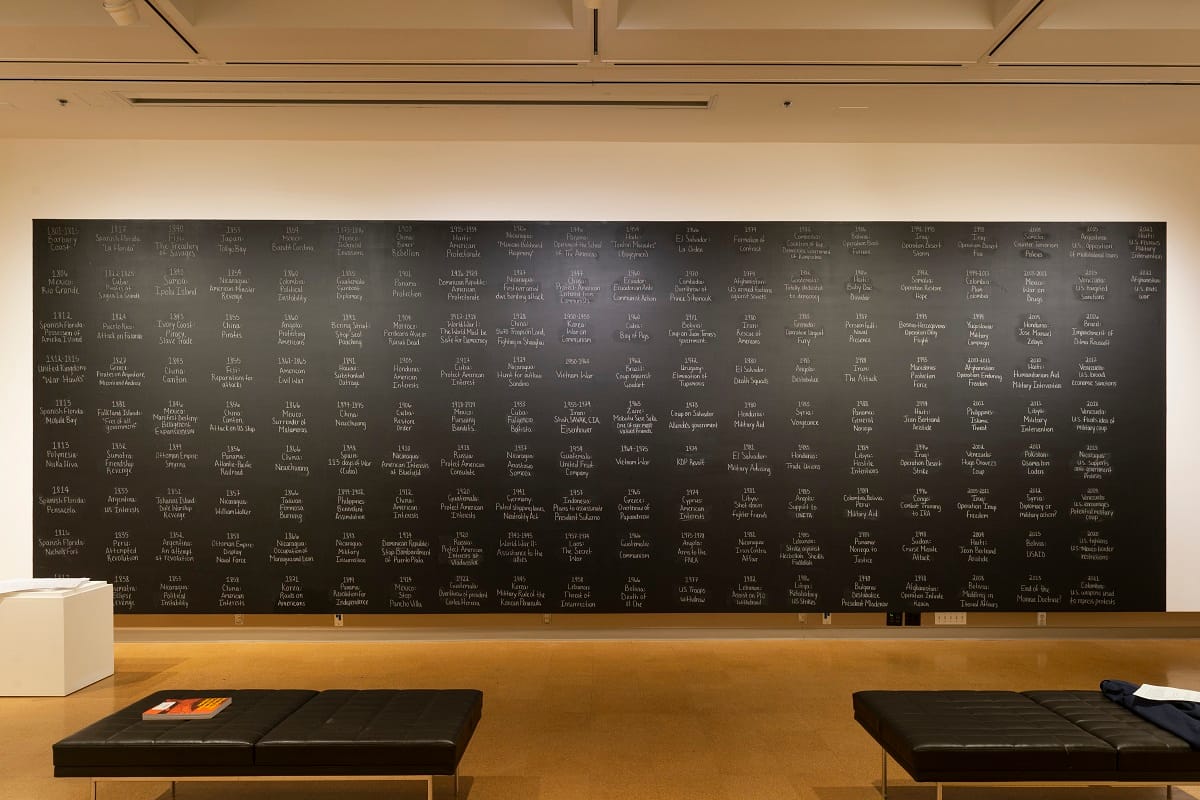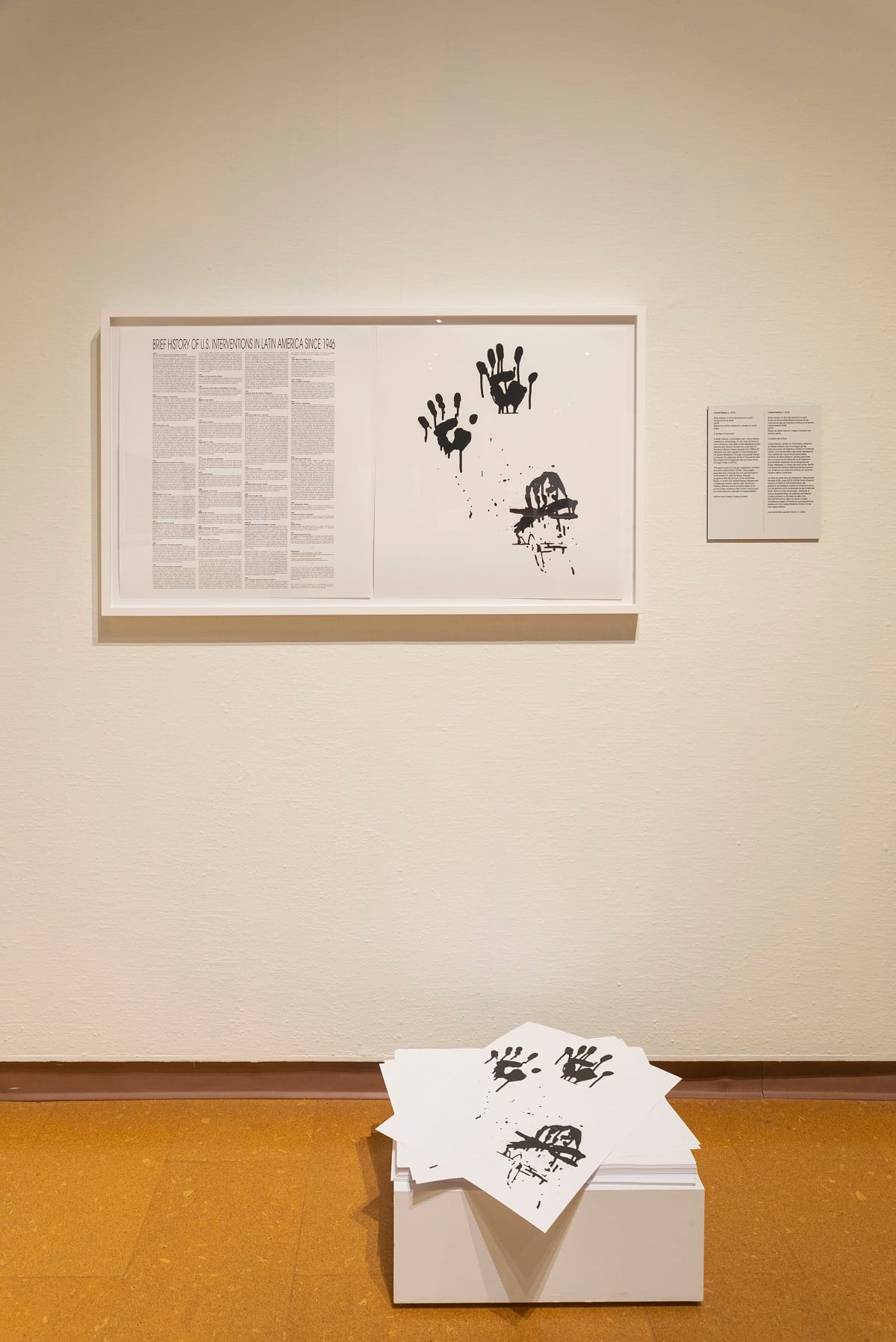 While Artists Call was a transnational organization, Art for the Future focuses on activities that occurred in New York City. Providing historical context of the events leading up to the Artists Call campaign is the fifth edition of “Brief History of US Interventions in Latin America Since 1946” (2005–2014), a two-sided black-on-white print by Colombian-born multidisciplinary artist Carlos Motta. On one side is a timeline of events recounting the history of US military, financial, and political incursions in Central American and Caribbean nations through 2013. On the other is the haunting image of dripping handprints, the signature of Mano Blanca (White Hand), an anti-communist death squad. On the floor is a stack of prints for museum visitors to take away and refer to as they experience the exhibition.