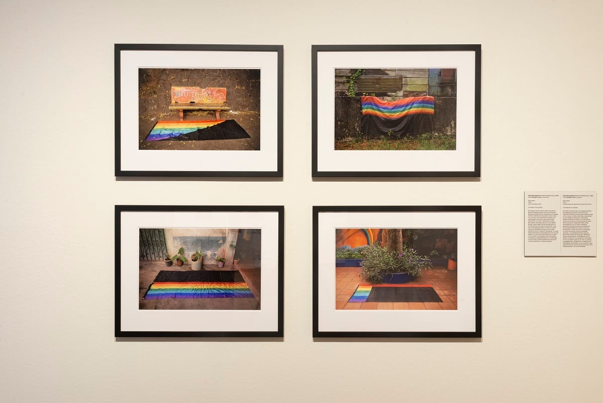 A few pieces criticize blind spots in Artists Call and movements like it that demand freedom for some but exclude certain groups. Jerri Allyn’s spoken word “Queer Revolution” (1984), performed with Debra Wanner, brings attention to the political oppression of queer people — oppression that would not be relieved by the efforts of Artists Call. Decades later, Elyla Sinvergüenza (Fredman Barahona) and Christian Lord’s collaborative work “Ban_deras” (2014) involved the creation of 16 flags hybridizing the red and black Sandinista National Liberation Front and rainbow LGBTQ+ standards. Sinvergüenza and Lord photographed their flags at sites of cultural trauma, political protest, and queer establishments throughout Nicaragua to bring attention to the continued, though often underrepresented, presence of queer people in the country.