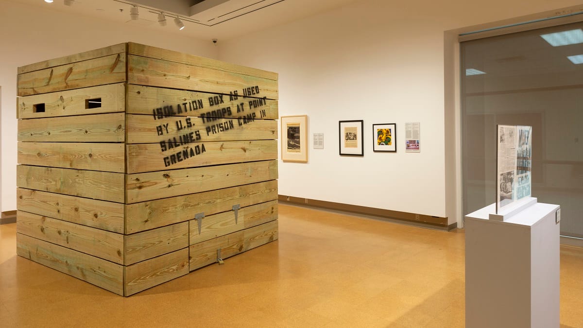 Hans Haacke’s “U.S. Isolation Box, Grenada, 1983” (original 1984, remade 2021) is the most imposing piece in the exhibition. The eight-foot cube, built of unfinished wood planks, is a recreation of boxes US troops used as cells in the Point Salines prison camp during the US invasion of Grenada in 1983. Small holes allowing light and air to enter the box are cut above eye height so that the prisoner inside cannot see out. Imagining oneself inside the box elicits intense feelings of claustrophobia and hopelessness.