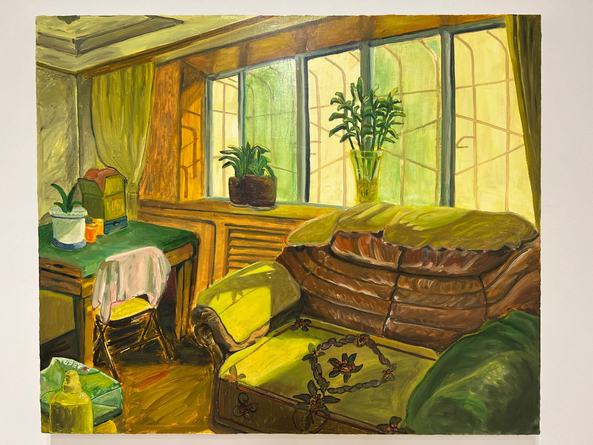 Installed in a narrow corridor at the gallery entrance, Lu Zhang’s painting “Who Left the Light On for Me?” (2021) presents a simple domestic scene in shades of olive green. A window-stained yellow projects sunlight into the empty room, yet a long shadow across the sofa hints at a phantom presence. The artist portrays her own grandparents’ living room after their death, referencing a Taoist tradition to preserve the residence of the recently deceased for when their spirits return.