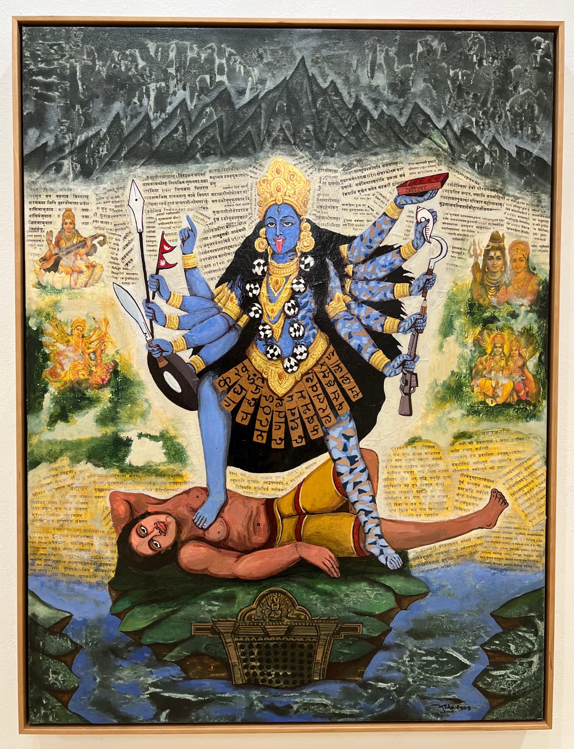 A second, wider room in the gallery hosts larger-scale paintings and installations. Nepali artist Asha Dangol portrays the Hindu goddess Kali standing atop a man’s body, wielding a knife, gun, and sickle in her many arms. At the center, Wu Jian’an’s breathtaking “Nirvana of the White Ape” (2014) portrays a paradise scene adapted from the Ming dynasty-era novel The Battle of Wits Between Sun and Pang. Rendered with technicolor wax on wood, this garden of earthly delights is utopian and psychedelic, showing colorful bodies in ecstasy among warped trees, and the title character laid out on a tiger pelt.