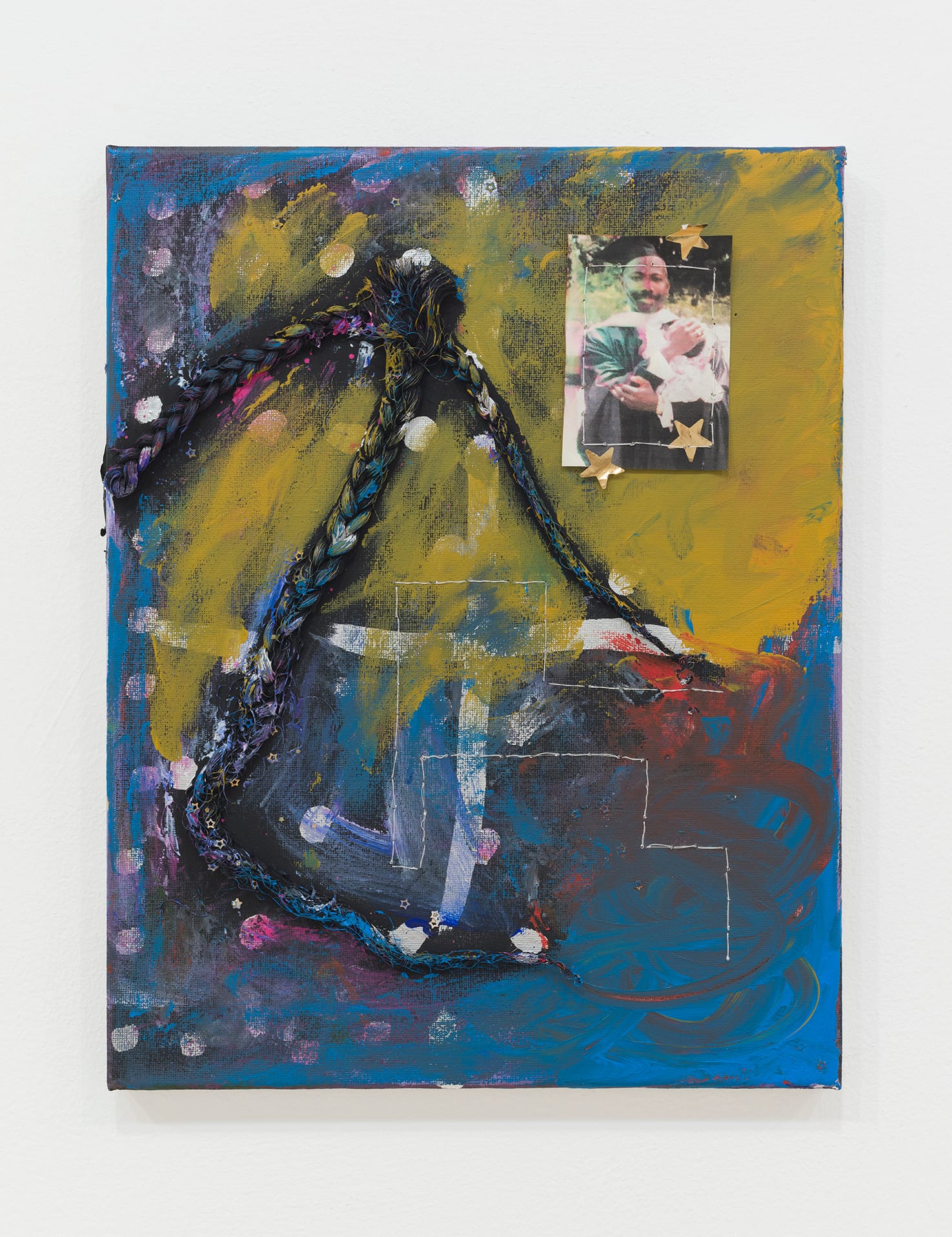 This personal tribute is accompanied by a smaller painted collage by St. John’s alumna Brittany Adeline King. An amalgam of the Tau and Latin cross, made entirely from braids of the artist's hair, spans the entire composition. At right, a photograph of King as a child, with her father, grounds sacred traditions in the near present. Between Zhang's and King’s works, a mirror against the wall offers the viewer a somber point for self-reflection.