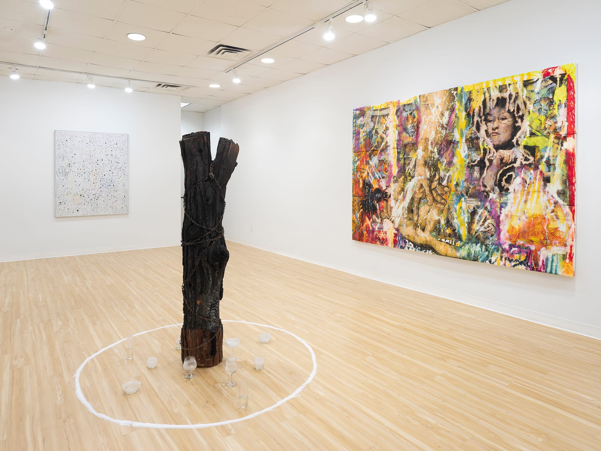 Popular Chinese literature from that era, such as Journey to the West, promoted a bridge between the Eastern and Western hemispheres, even while European orientalists projected Christian fundamentalism on underdeveloped countries. Joseph Liatela’s sublime homage to Joan of Arc roots this tendency in Europe's own religious persecution. An enormous burnt stake stands in for the martyred gender-variant icon, who was subsequently canonized. At its base, a set of drinking glasses filled with ocean water correlates with the number of trans people murdered in the United States so far this year, partially due to Christian nationalism.