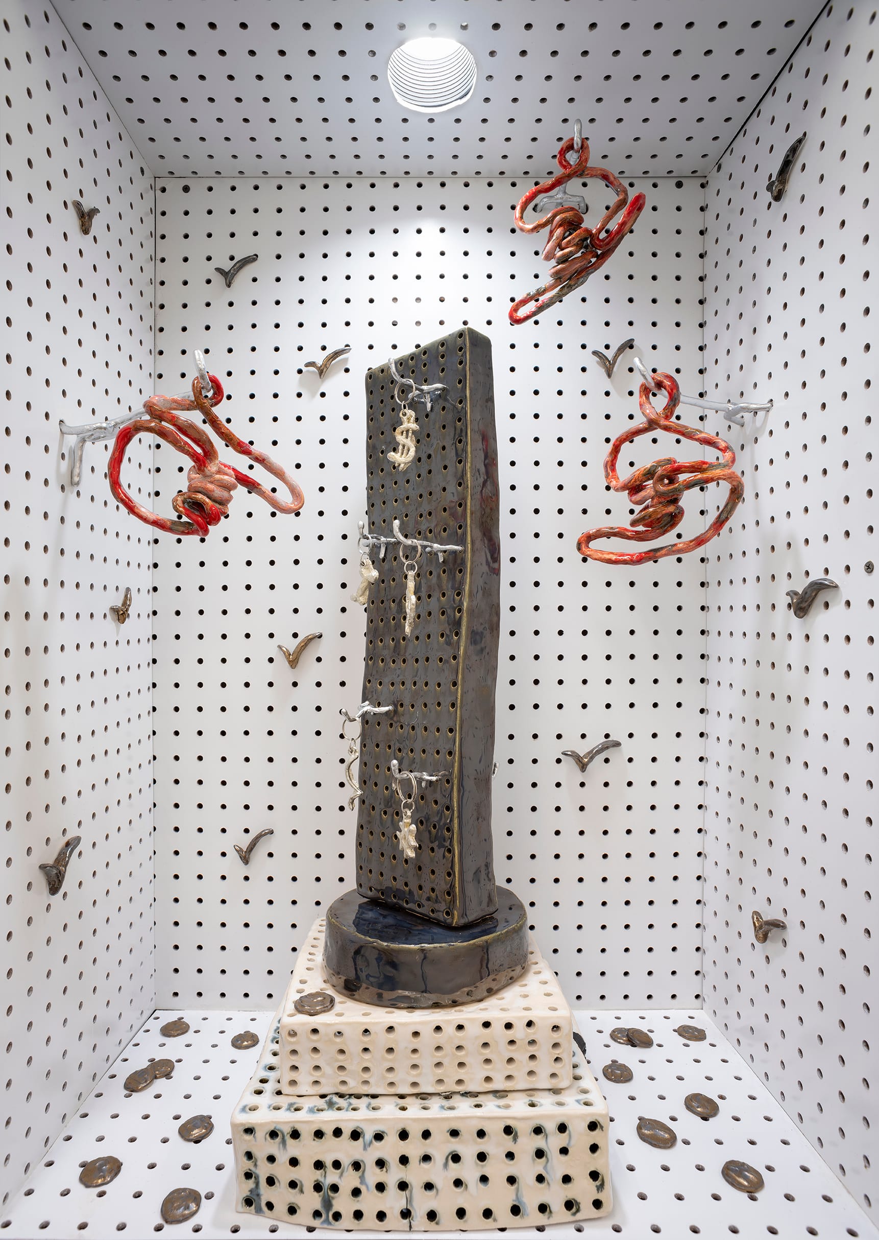 In a series of window vitrines outside the gallery, Hallie McNeill shows how capitalism depletes faith. The sculptural installations that comprise Your Best Life (2022) display calendars, to-do lists, and storefront racks with hanging crosses and dollar signs, all of which are ceramic, positioning enlightenment within the confines of consumer choices. The items bring to mind the negative connotations of “labor” and “organizing” as solitary chores. Evoking spiritual bankruptcy, McNeill’s work reveals that bridging hemispheric gaps should lead us away from individualistic responsibility, and instead revitalize our faith in each other.