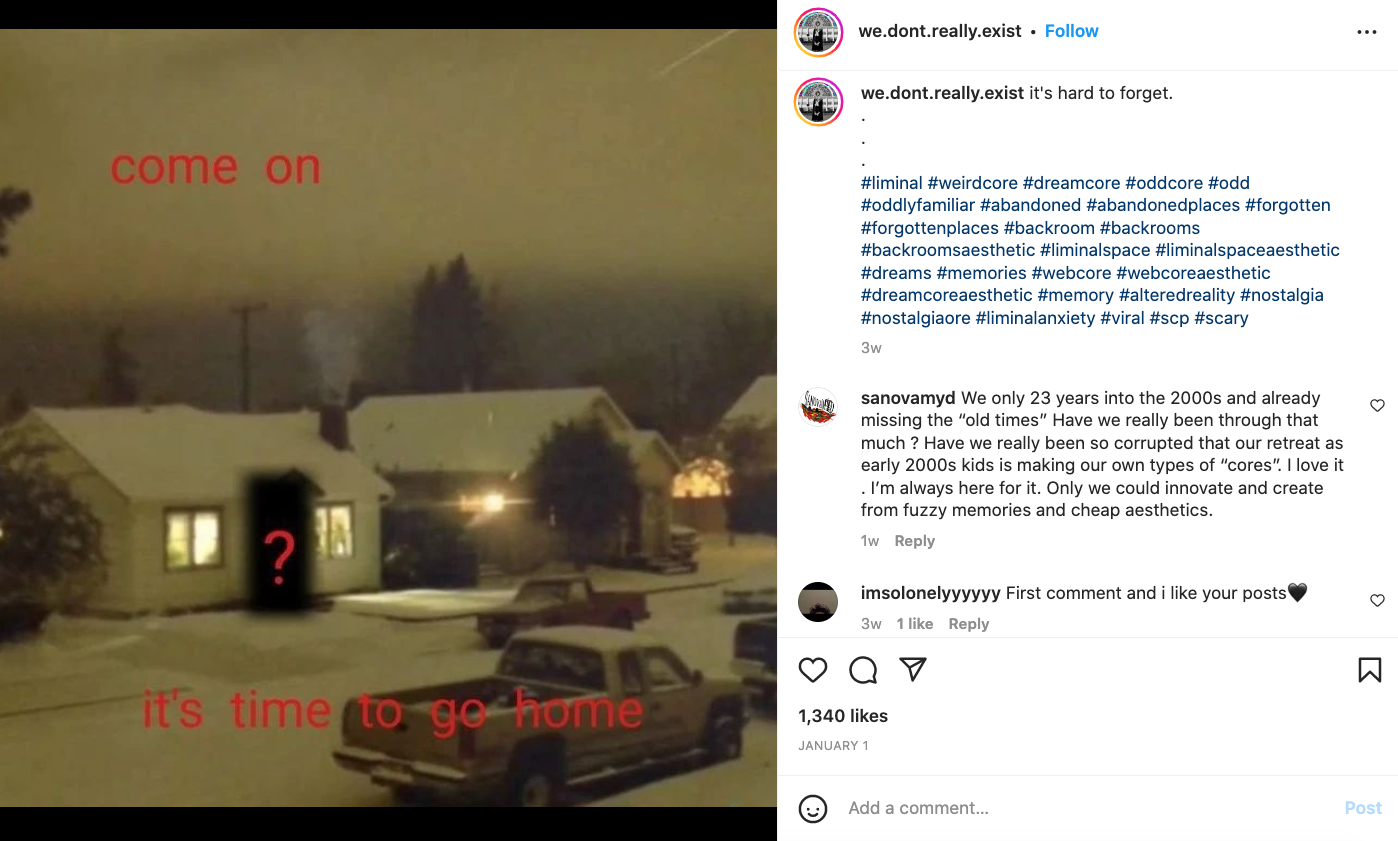 Something that I can appreciate about Corecore is its distinct ability to pinpoint both highly nostalgic and anxiety-inducing moments across a large audience through an evolved use of what I would consider its predecessor, "Weirdcore." According to the Aesthetics Wiki page, Weirdcore is a "Surrealist aesthetic centered around amateur or low-quality photography and/or visual images that have been constructed or edited to convey feelings of confusion, disorientation, dread, alienation, and nostalgia or anemoia." Weirdcore primarily resides on the depersonalization and trauma sides of Tumblr, but appreciation for the aesthetic has been renewed on Instagram, Reddit, and TikTok as well.
