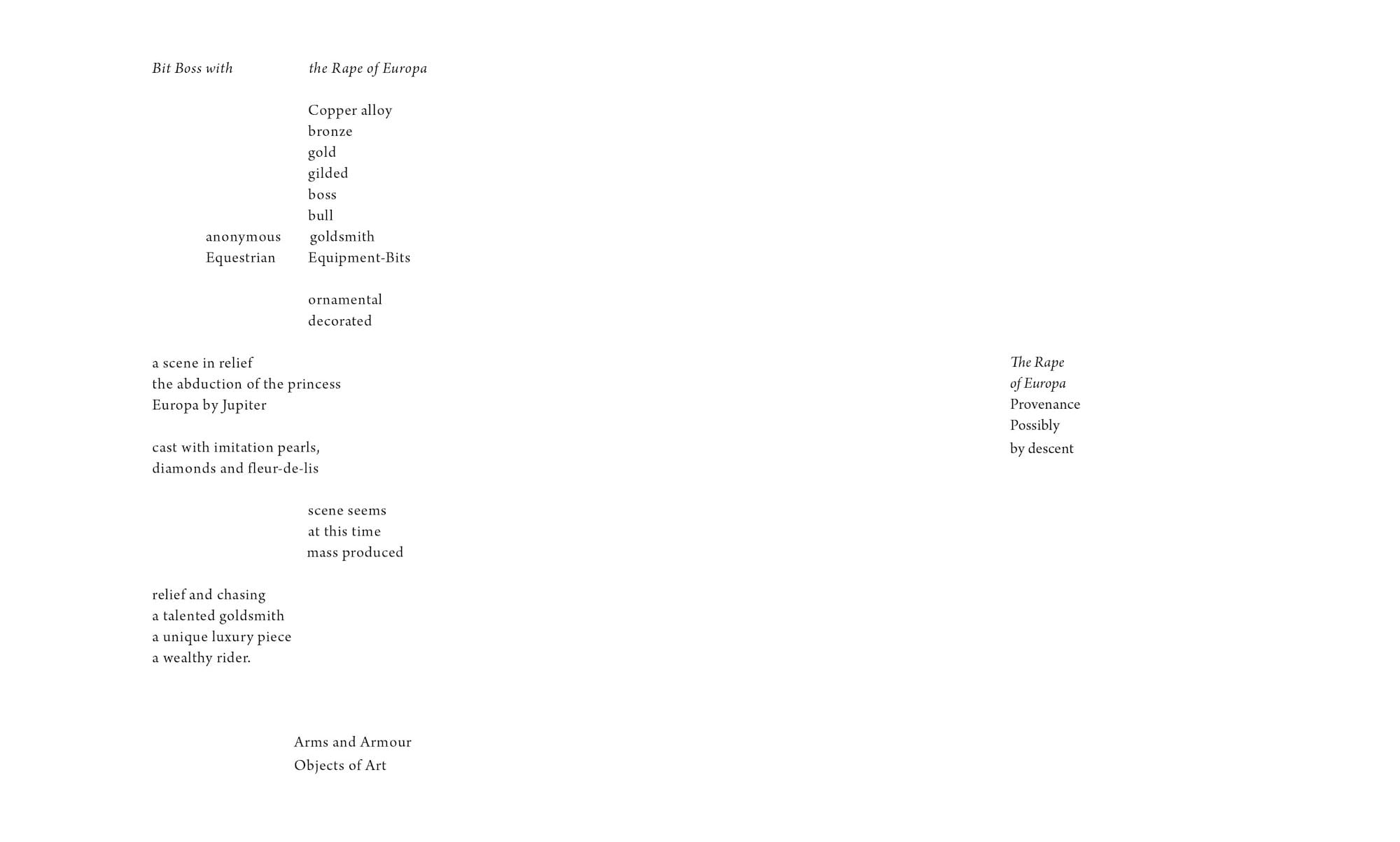 Without editing or adding to the Met’s cataloguing data, which includes basic details like title, medium, and dimensions as well as provenance details and contextual essays, she parsed and rearranged the texts in poem-like stanzas to be printed in 181 individual books, one for each artwork. A gilded bronze boss from the Netherlands, which originally decorated one side of a horse bit, cites the brutal origin story of the European continent: infatuated with Princess Europa, the god Jupiter disguised as a bull abducted and raped her on the island of Crete. Robinson has parsed and reshuffled the museum's cataloguing text to highlight the precedence of stylistic and formal aspects over discussions of the violation invoked by the work.