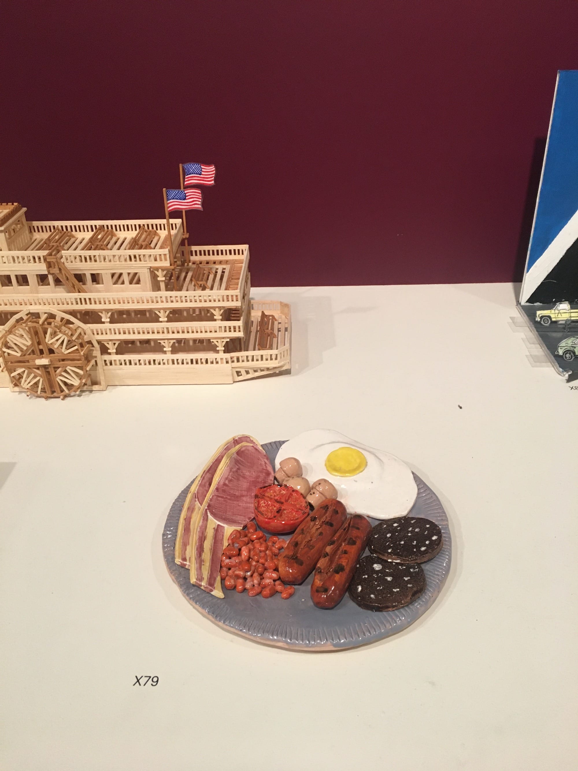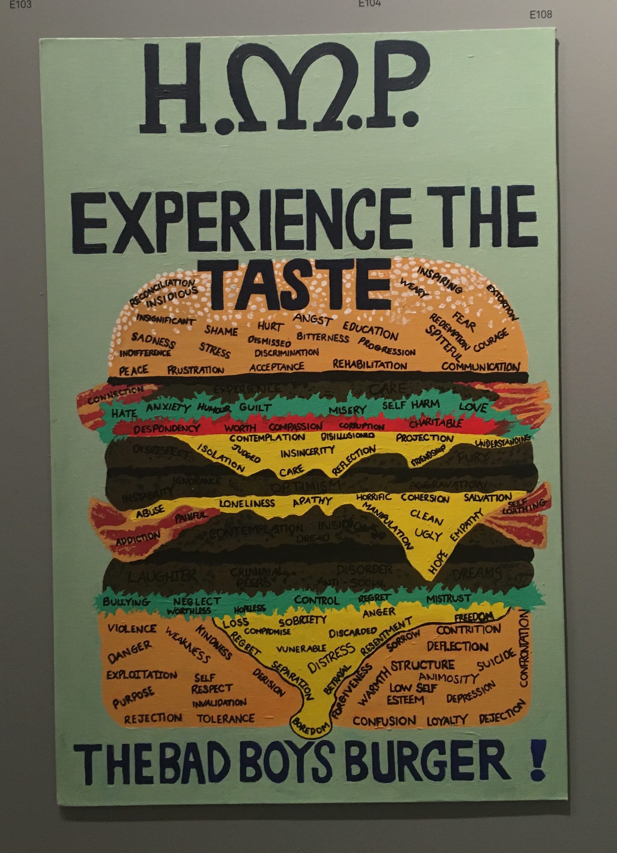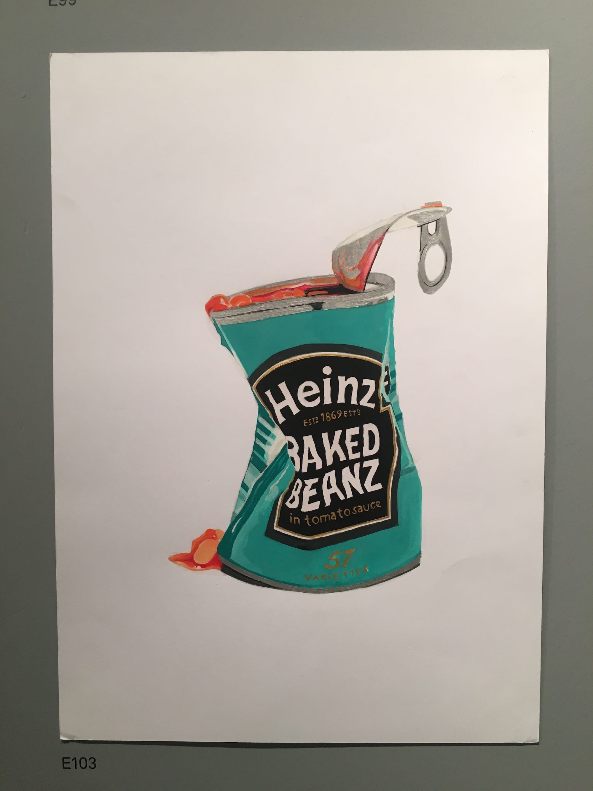 This year’s theme, Taste, has produced some inventive and witty works about food and drink. Several pieces recreate full English breakfasts, complete with streaky bacon and black pudding, in surprising mediums including ceramics, colored paper meticulously coiled and assembled on canvas, and acrylic painted directly onto a disposable plate. A particularly striking piece is the “H.M.P. Bad Boys Burger,” in which every layer of the heavily stacked burger contains words relating to the experience of incarceration, from care and courage to self-loathing and abuse. Another standout is a re-imagining of Andy Warhol’s Campbell’s soup can as a mangled but strangely beautiful tin of baked beans with gloopy sauce spilling out.