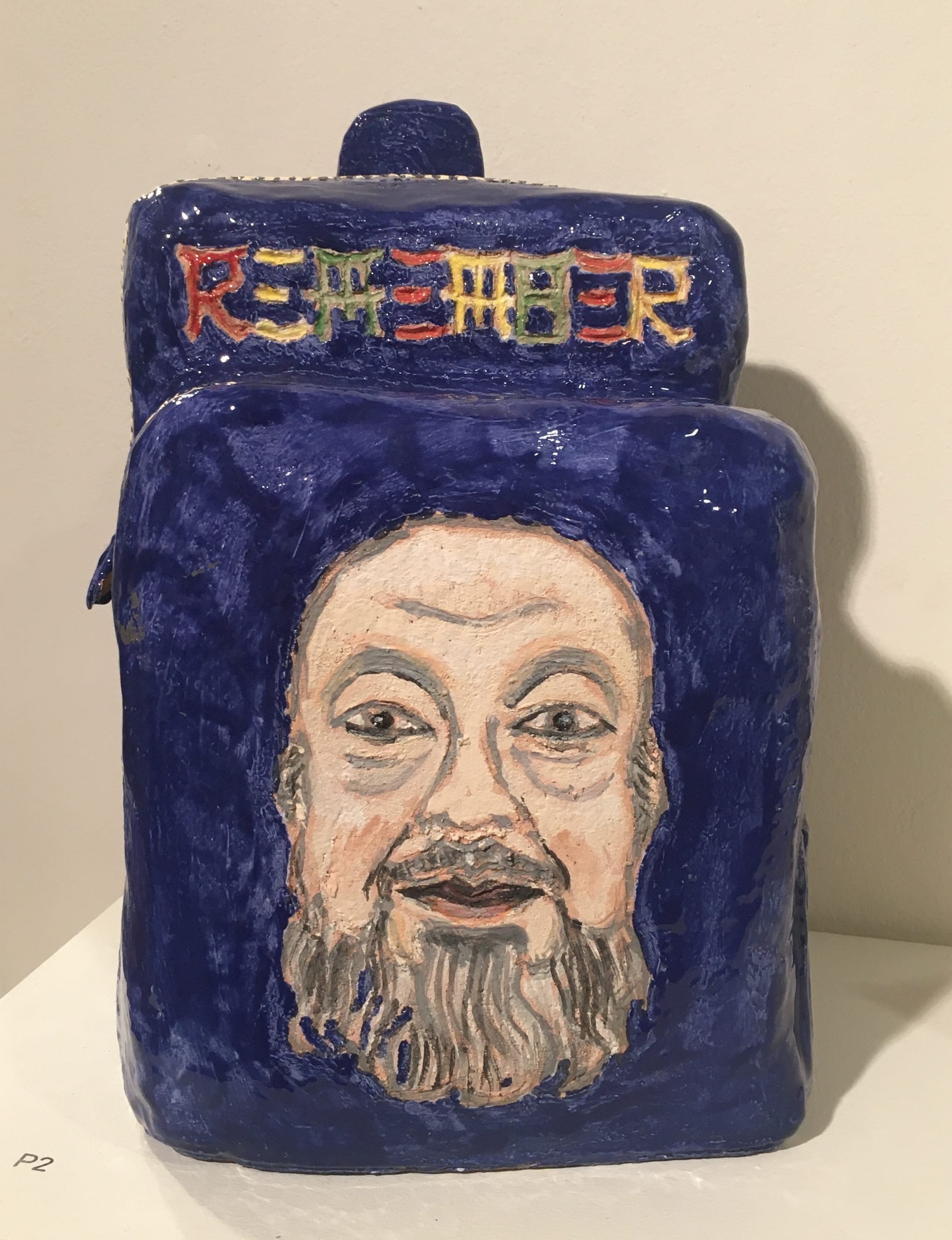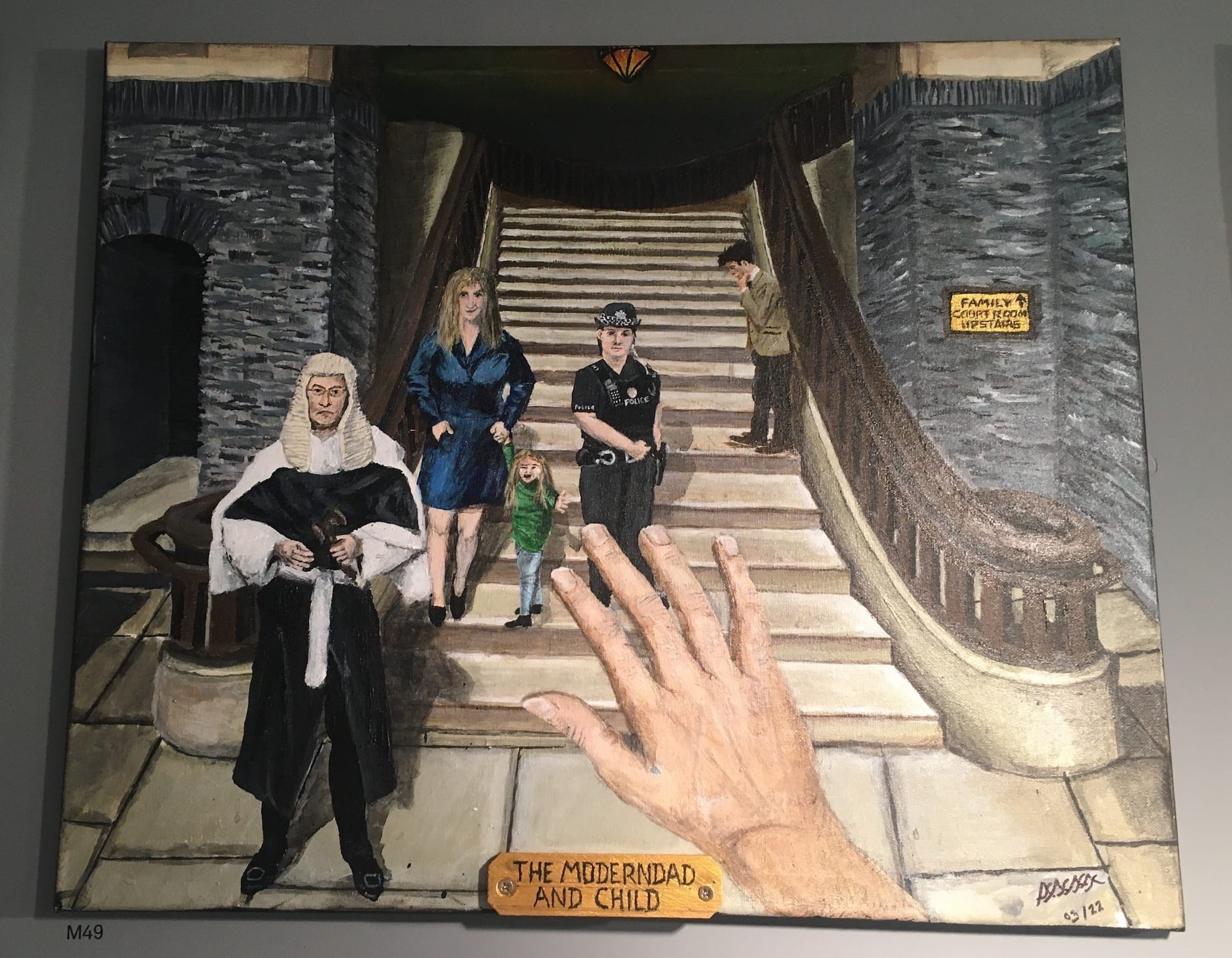 Other works in the exhibition reference recent political events, such as Russia’s invasion of Ukraine. In one piece, named “No More War,” a soldier cradles a young woman; the background is a Union Jack, half of which is painted in the Ukrainian national colors of blue and yellow. The same colors adorn a ceramic work, titled “Together as One,” along with the slogans “we stand together, we play together, we fight together” and “no room for racism.” Alongside these visions of solidarity and community are reflections on the trauma of family separation. In the heartbreaking painting “The Modern Dad and Child,” a mother and child stand on the steps of a courthouse next to a stern-looking judge and policewoman. In the foreground is an outstretched hand, as the dad beyond the frame reaches for his child’s hand.