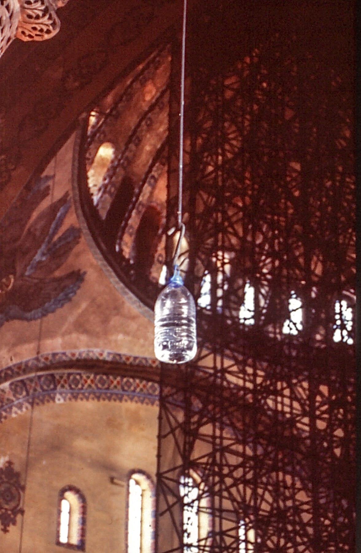 On the occasion of the 2003 Istanbul Biennial, American artist Tony Feher (who died in 2016) developed a new artwork specifically for the Hagia Sophia Museum. Feher was known for installations that skillfully engaged architectural space by incorporating everyday industrial materials such as water bottles, painter's tape, chains, string, zip ties, and glass marbles. After a long deliberation process, Feher installed “Nature is Over”(2003) on the second floor of the museum. Composed of blue tape applied delicately to second-floor windows, the installation also featured a plastic bottle hung from an iron chandelier. Feher's work in this majestic space alluded to the religious stained-glass tradition by minutely changing the quality of the light. His work focused on the power of illumination, hence the additional chandelier in the form of a mere plastic bottle, creating a surprising contrast with the authentic architectural elements.