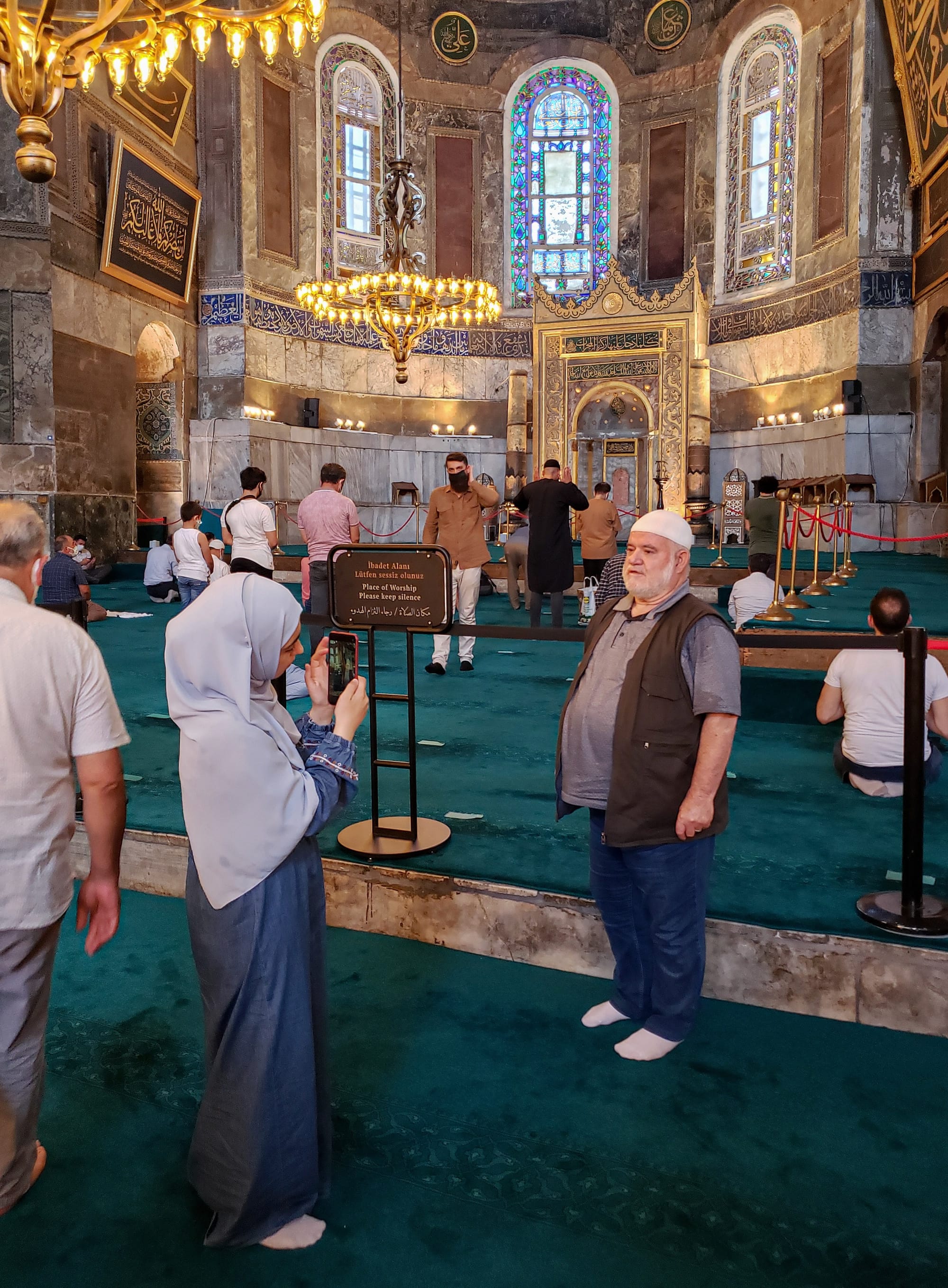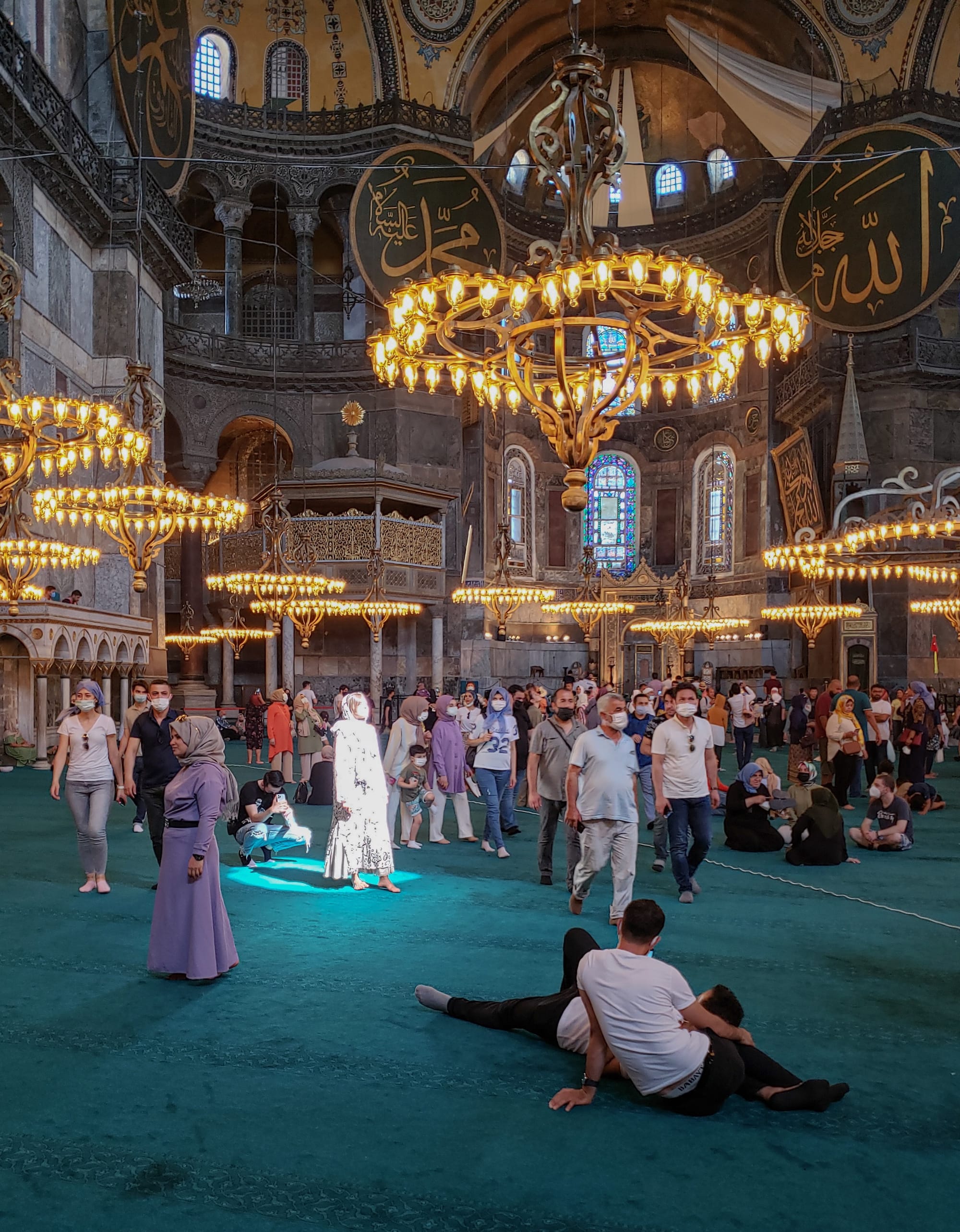 Nothing new in this mosque was pretty. The space felt dirty. Cheap plastic carpet blanketed the beautiful stonework while radiating unpleasant odors. Gorgeous frescos were covered with a curtain system more appropriate for marina cafes. The Virgin Mary was double veiled. And the great dome that Mimar Sinan studied so intensely no longer felt majestic. Many of the museum sections, including the second-floor gallery, were not accessible to the public. Masses filled up the interiors; some religious men posed victoriously in front of the covered frescoes, while the Middle Eastern petit bourgeoisie seemed more interested in their selfies than anything else.