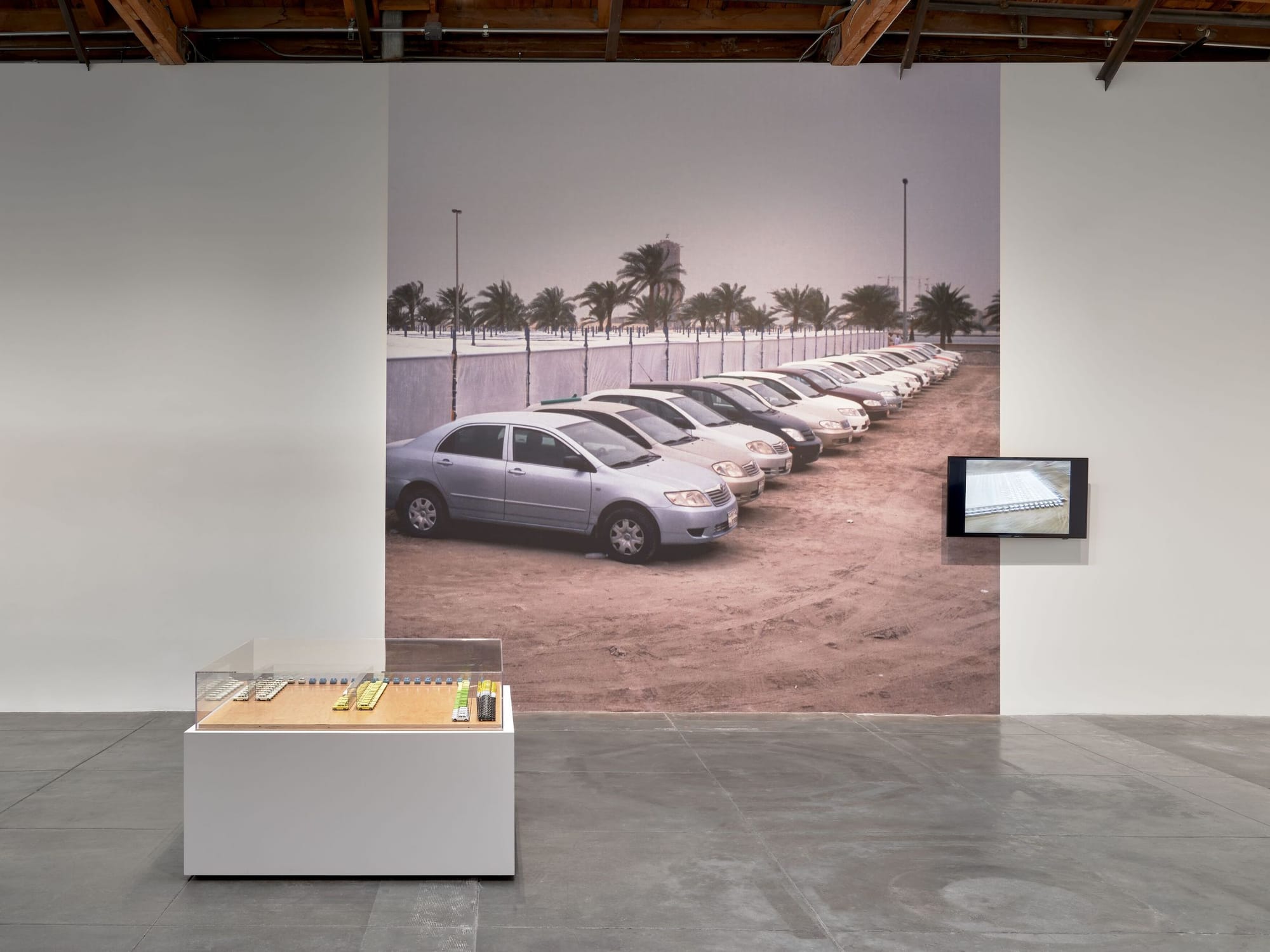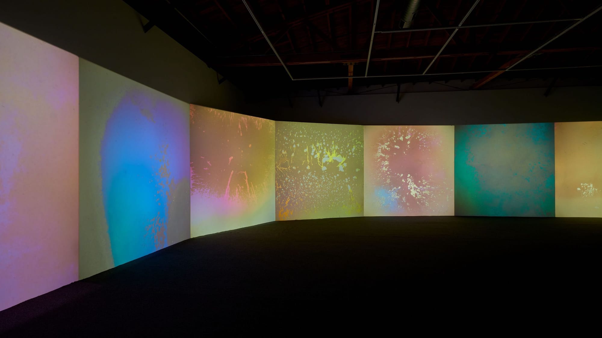 And Then Came the Environment is Metzger’s first US show at Hauser & Wirth since the gallery began representing his estate and foundation in 2020. The title is excerpted from his 1992 essay “Nature Demised,” which condemned corporate and governmental environmentalism for their a priori investment in mass production and capitalism. Metzger’s approach to the issues addressed in his writing is subtle and prescient, attuned to the ways scientific invention can simultaneously awe and harm. In one darkened gallery, the hypnotic “Liquid Crystal Environment” (1966/2024) displays a semicircle of seven floor-to-ceiling Kodak slide projections onto liquid crystal displays (LCDs). The work comes across like an allegory of global warming: the LCDs, composed from the same material in phone, computer, and radar screens, show oozing rainbows of color that morph based on the heat of the projector and the bodies in the room.
