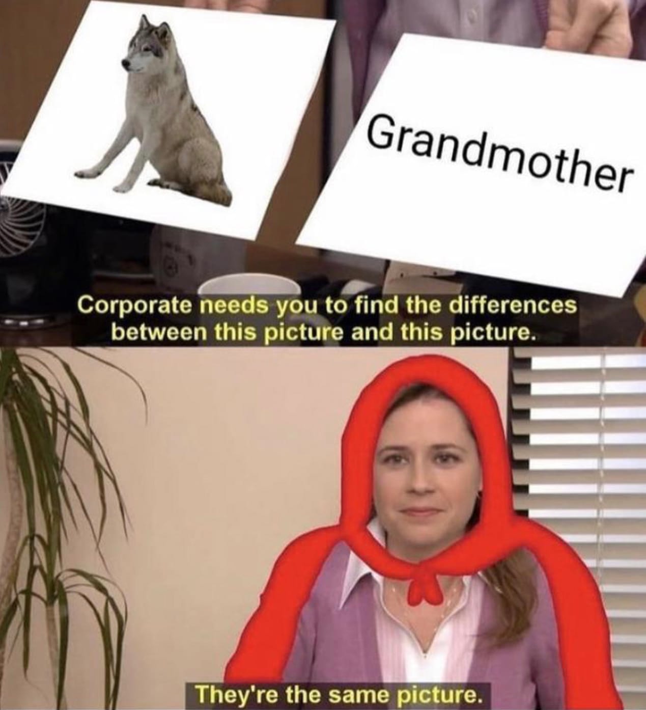 Wryly reinterpreting the cultural touchstone of Little Red Riding Hood, this work transposes the fairy tale into a two-panel format referencing the hit television show The Office. Old and new fruitfully blend in a pastiche that bridges three communication technologies: an oral tradition, a broadcast tradition, and a digital tradition. By equating the word “grandmother” and the image of “the wolf” in the first panel, the meme works to elide differences between the graphic and semantic modes, while rearticulating their productive image-text tension into yet another mode (the digital) where image and word are each equally reduced to the status of pixel.