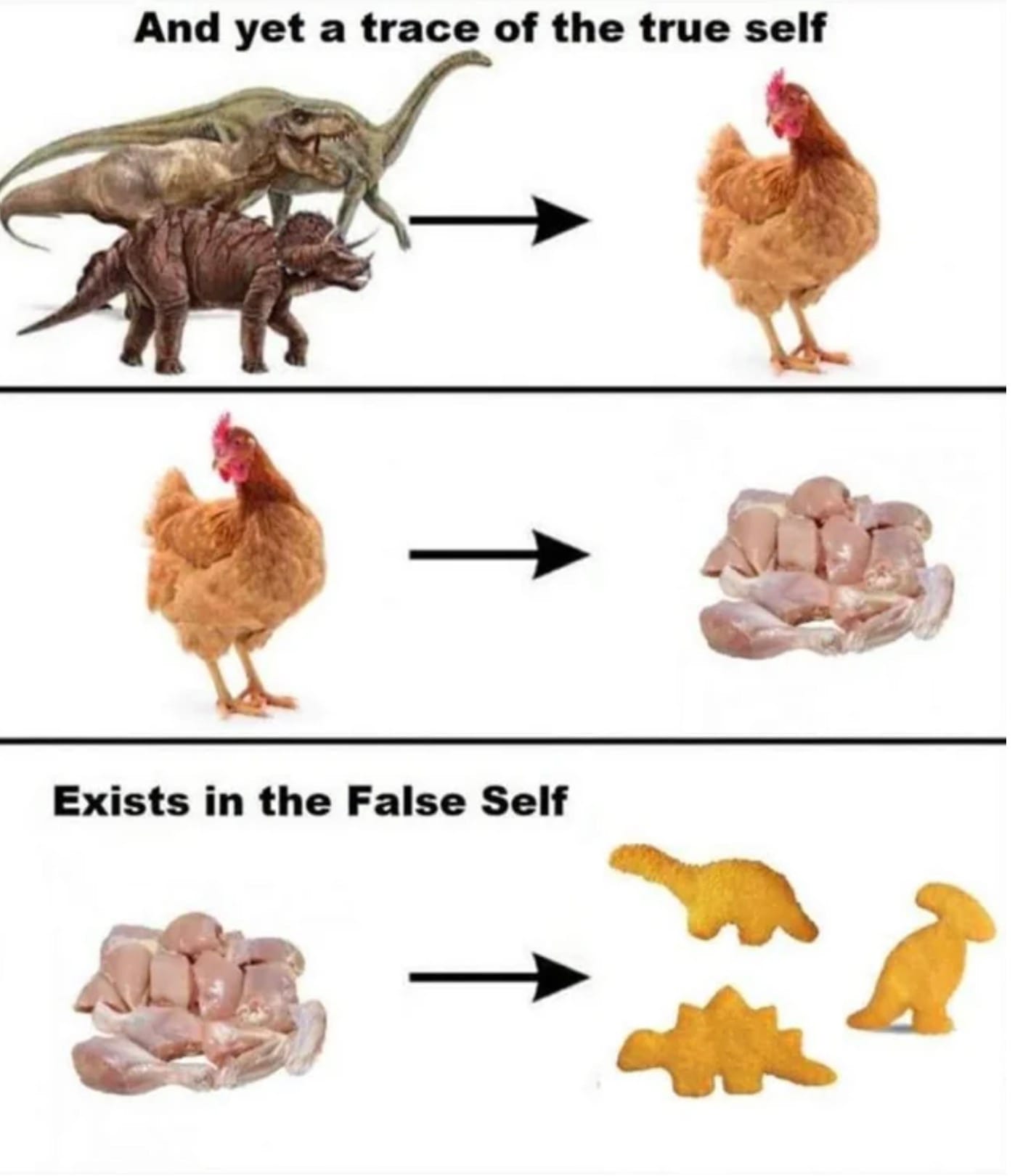 This work implicitly equates evolution with the synthetic processes of early-21st-century capitalism, but even as it naturalizes the extractive excesses of late capitalism, the image calls into question the capacity of those same reifying industrial processes to fully commodify the seen world. Whether human interventions are simply a reflection of broader organic processes remains open to interpretation, as this meme nods towards an essentialist concept of transhistorical truth or at least contiguity with respect to the speculo-ontological status of “the dinosaur.”