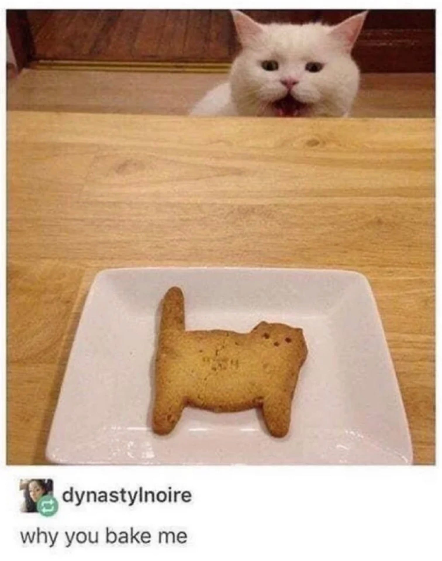 Recapitulating the cat-turned-into-dessert motif of the meme shown in the adjacent gallery and discussed above, this work again emphasizes the tension between representation and the real. But here, the act of visual depiction is interpreted by the cat as a form of predation. Considered more broadly, the speech act attributed to the cat (“why you bake me”) is in itself a question not marked as such, through which the cookie’s inception is echoed by the meme’s own “baking” of the cat’s image and fundamentally non-verbal meow into a second-order digital representation of its fundamental catness, or cattitude.