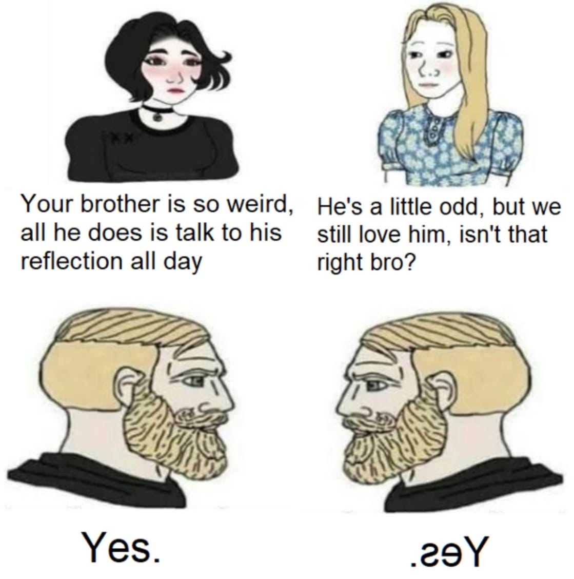 This early-2020s meme is part of a Commedia dell’Arte-esque posting tradition featuring stock characters such as the modified Wojaks comics of Doomer Girl (top left), Tradwife (top right), and Yes Chad (bottom). The work performs a double maneuver through which Yes Chad’s reflexive address to himself in the mirror parallels the meme’s own auto-reflexivity vis-a-vis medium. By depicting the typically macho blonde-bearded Yes Chad as an eccentric younger brother, the meme rubs against the grain of its own interpretive frame, calling into question the assumptions about masculinity and the 4chan-derived four-panel form on which Wojak Comics traditionally rely.