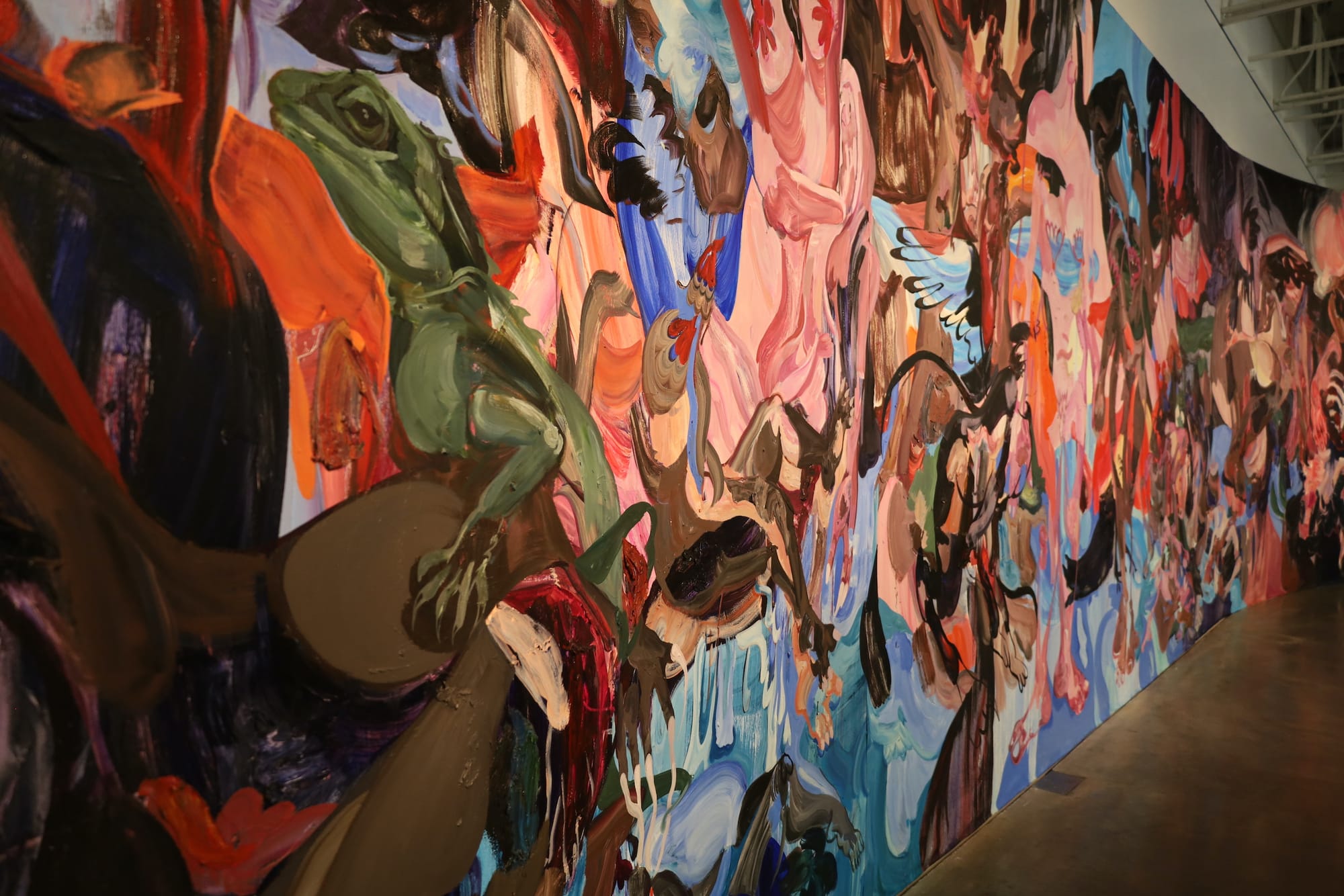 Wynnie Mynerva’s first solo exhibition in the United States, The Original Riot at the New Museum, centers on the largest painting ever displayed at the institution. At 70 feet wide, it stretches across five curved panels, a dramatic saga of feminine celestial vengeance unfolding across the space, as the figure of Lilith takes out her right rib — known as “Adam’s rib” — and hands it over to Eve.