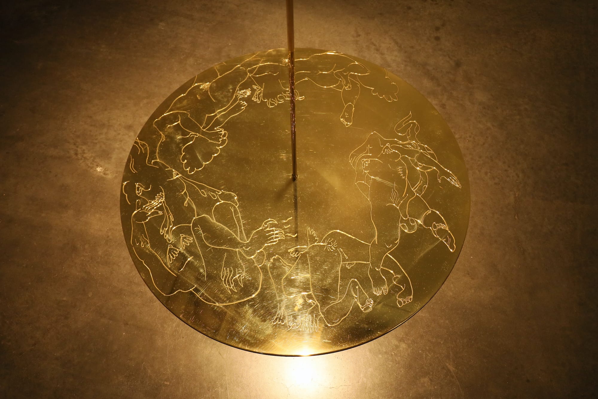 Located behind the gap between panels four and five of the colossal painting, the sculpture “The First Cut” (2023) features a brass display stand engraved with an entanglement of contorted bodies — representing a mythological meeting between Eve and Lilith, in which Eve removes the rib from which she was created and the two women create an alternative Genesis. Seeking to display a physical relic of the Genesis story, the artist had her right rib surgically removed for the show. “I wanted to have an artifact that proved that the story was true,” she says in a short documentary by the New Museum. The Peruvian artist’s rib is delicately balanced atop the thin, engraved brass display.