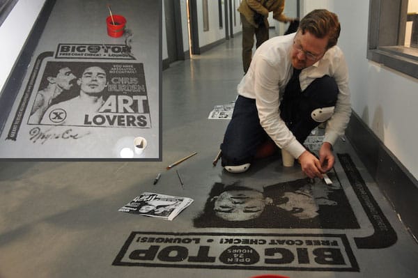 As part of the Brooklyn Art Now survey, curated by James Kalm (aka Loren Munk), Coe was creating “Chris Burden in Art Lovers” (2011) in the second floor hallway of 111 Front Street. Using black sand and brushes, he worked for six hours yesterday and took some time out of his performance to participate in another guerrilla video interview to explain “art-xploitation,” which he says is “the use of male film hyperbole to sell art.”