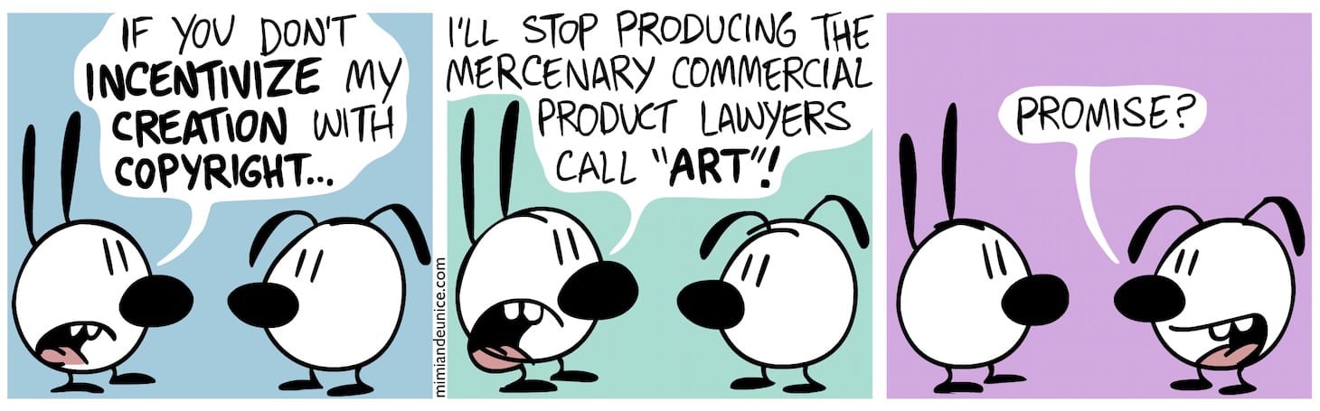 Anyway, it’s tempting to assume that more copyright is good for artists and less copyright is bad. But it isn’t so simple. Sure, many artists rely on copyright to generate revenue, but many others use copyrighted works to create their art. After all, art has always been all about copying. Artists learn by copying and copy in order to create something new. Collage, pop art, appropriation art, you name it, all technically infringing. Or rather, as Picasso observed, “Good artists borrow, great artists steal.” Even better if he “stole” the line, Pablo Picasso was always an asshole. It’s part of his appeal.
