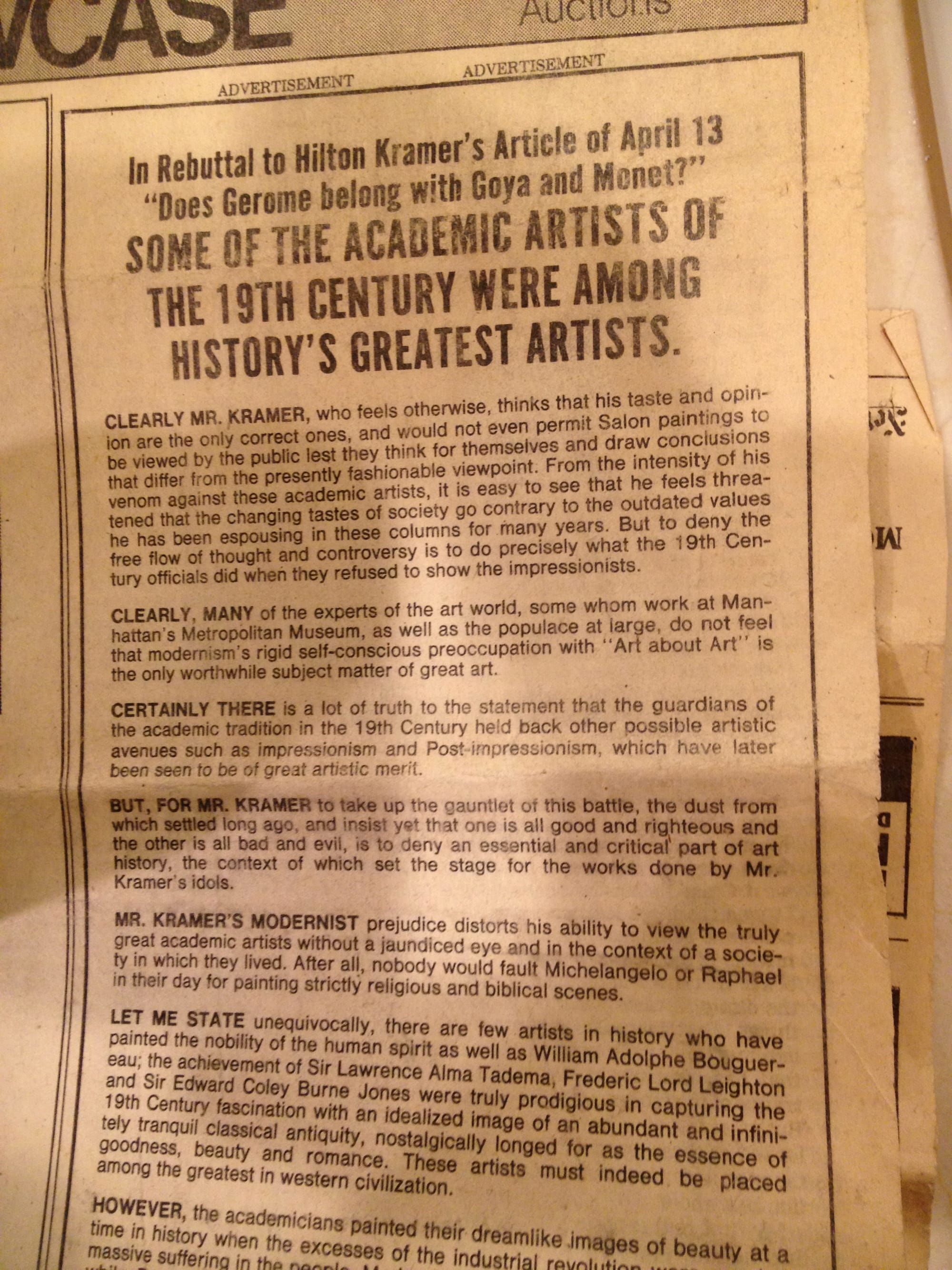 Another pivotal moment happened for Mr. Ross at the same time. The Metropolitan Museum of Art inaugurated the newly constructed Andre Meyer’s galleries in 1980. The new galleries were large enough to include an edge-to-edge survey of the Met’s collection of European works, including the salon paintings of the 19th-century academy that had been in storage for most of the 20th century. Academic postmodernism, it seems, had become an unlikely ally of Mr. Ross’s premodernism. In the New York Times Hilton Kramer wrote that those paintings should “remain buried,” for “it is the destiny of corpses, after all.” Kramer goes on to blame the “post-modernist dispensation.” He says, “No art is so dead that an art historian cannot be found to detect some simulacrum of life in its moldering remains.” Taking a cue from Wolfe, Mr. Ross intervened, and took out his own Times advertisement.