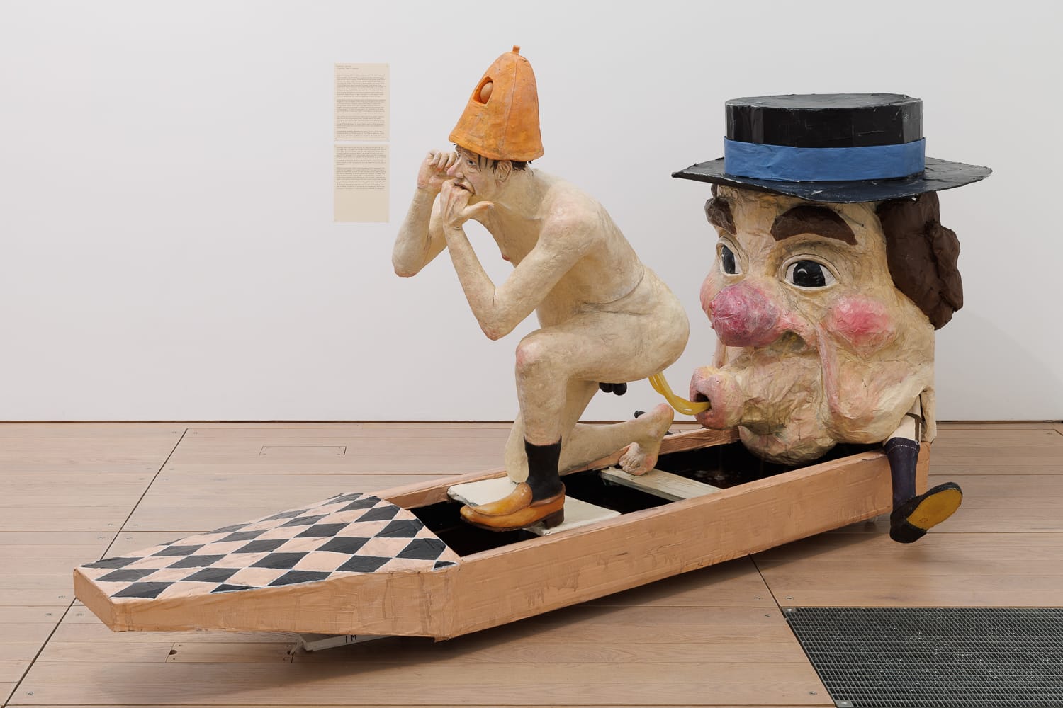 One of the most delightful and winningly outrageous works in the exhibition is the re-enactment of a slice of invented history by Dominic Watson called the "Grand Flushing.” A gorgeously buffoonish sculptural tableau shows a naked man on all fours, rump raised. He is undergoing an act of colonic irrigation for the lies that he has told during his lifetime as Prime Minister of England. This rite, the caption tells us, takes place at the end of a term in office, and it serves a twofold purpose: it is both an act of public purgation and cleansing, and a way of saying sorry for the victim’s miserable record of lies, deceptions, and treachery.