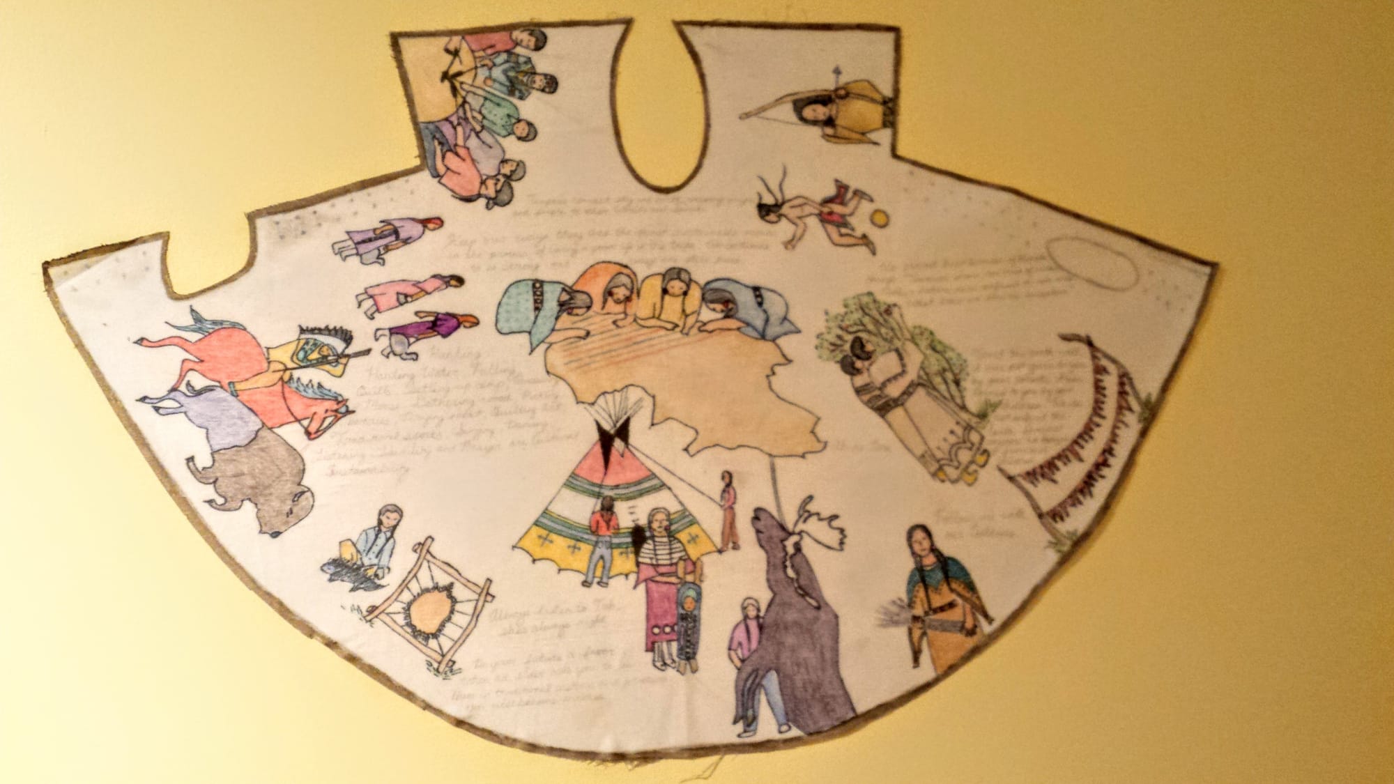 Sharron Ahtone Harjo, Kiowa Elder Artist, “Kiowa Ledger Tipi Documentation about Cultural Preservation” (2014) at the Institute of American Indian Arts, Balzer Contemporary Edge Gallery, Santa Fe, New Mexico (photo by the author and used with permission)