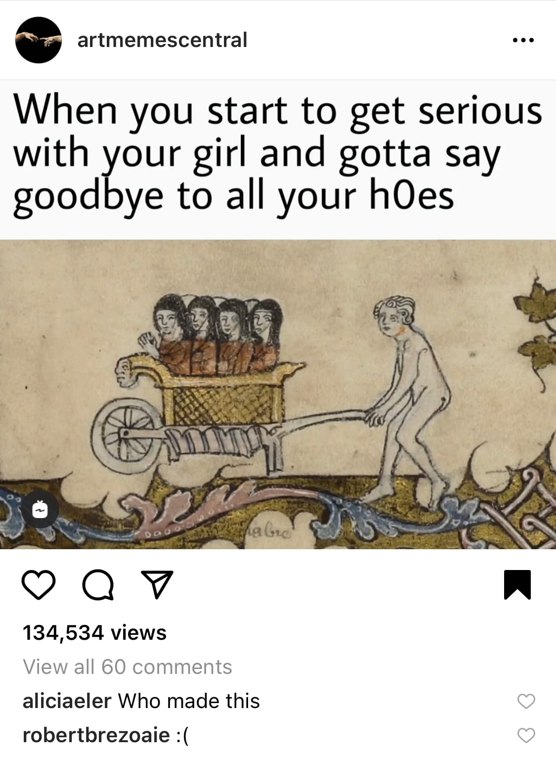 Many art historical accounts hit up medieval imagery for jokes. Take another meme from the @artmemescentral account, where an almost transparent-looking dude wheels four people with black cloaks over their heads into an otherwise bleak, yet ornamental scene. The caption reads: “When you start to get serious with your girl and gotta say goodbye to all your h0es.”