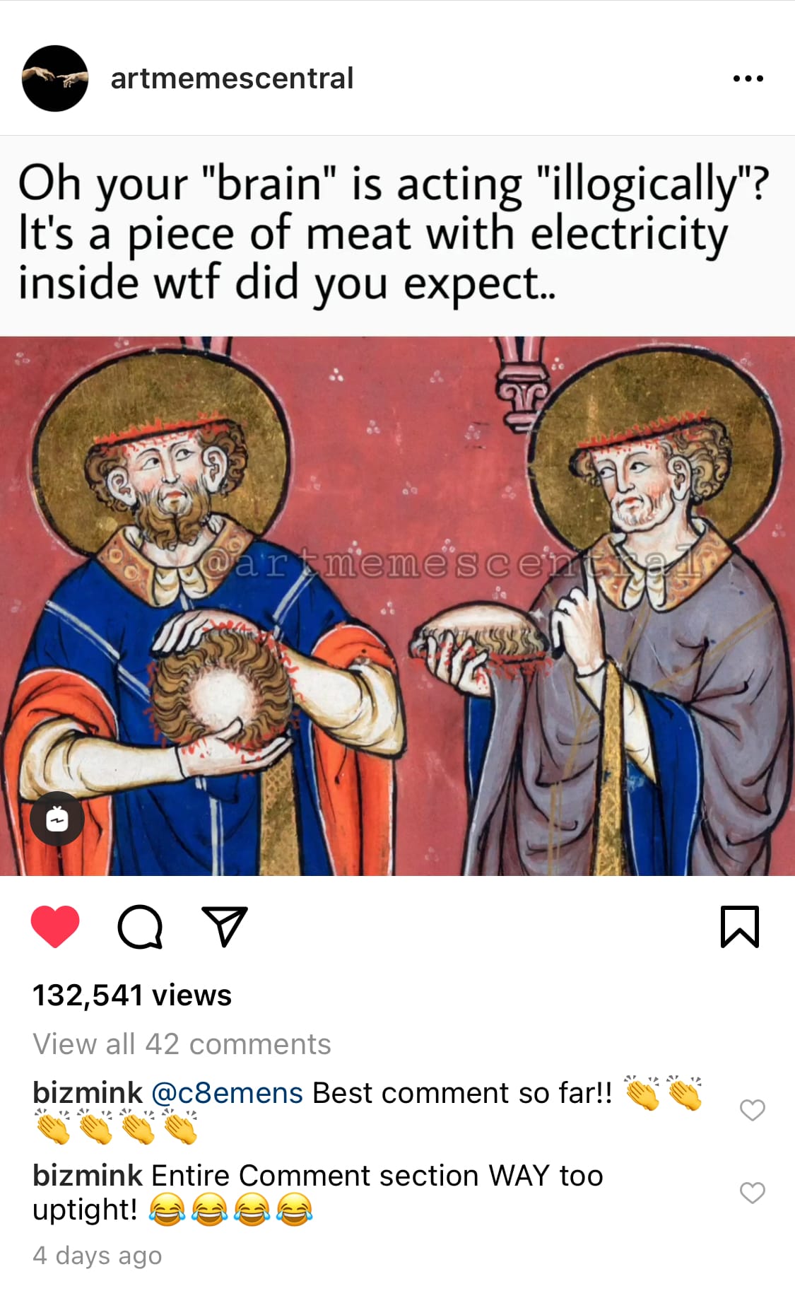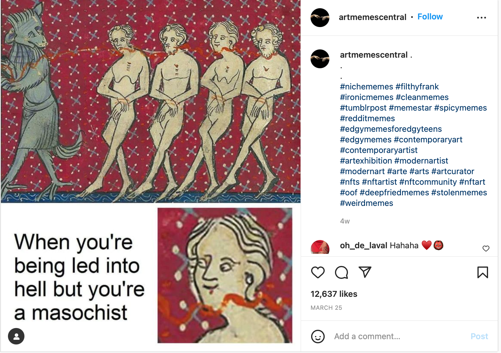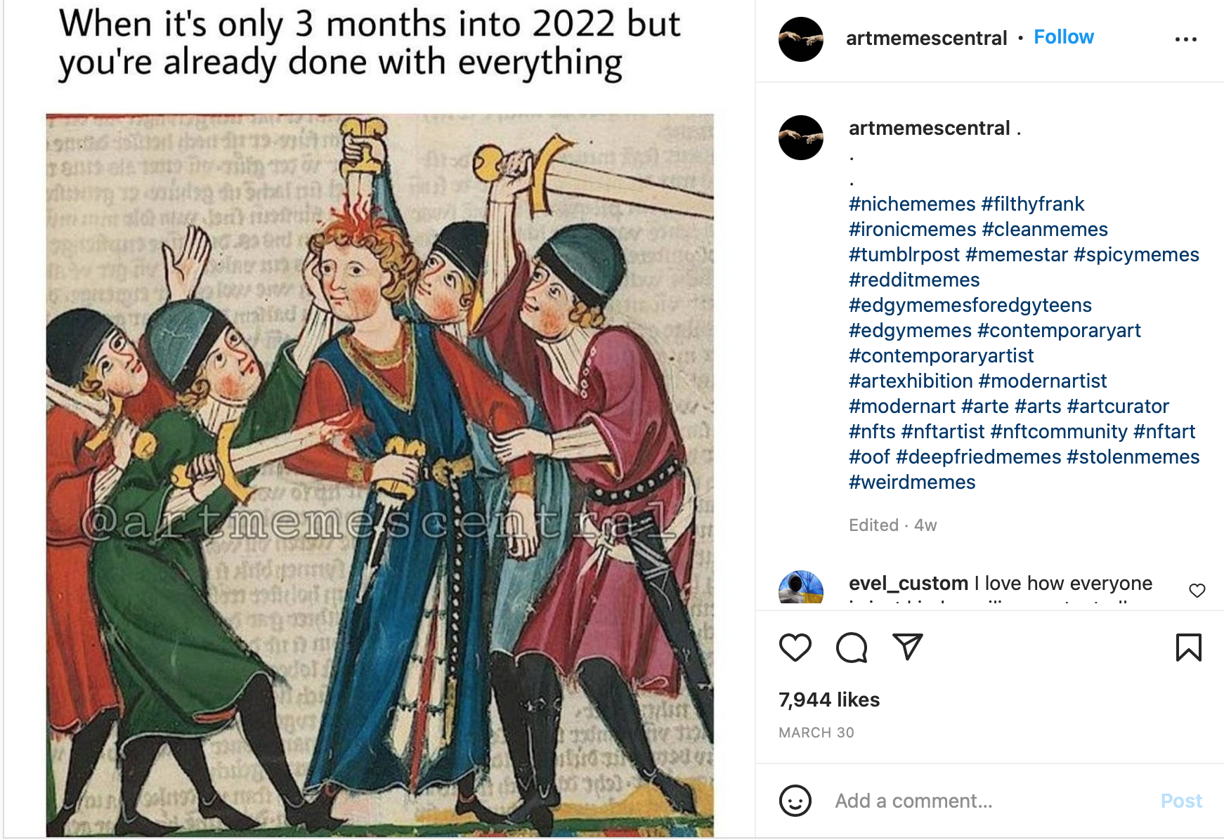 Most of the medieval art history memes come from broader art meme accounts, such as @artmemescentral or @classical_art_memes_official, though there are some discontinued accounts that focus only on medieval imagery, including @medievalmemes_, @medieval_meme, @medieval.memez, and @medieval_memes_and_facts.