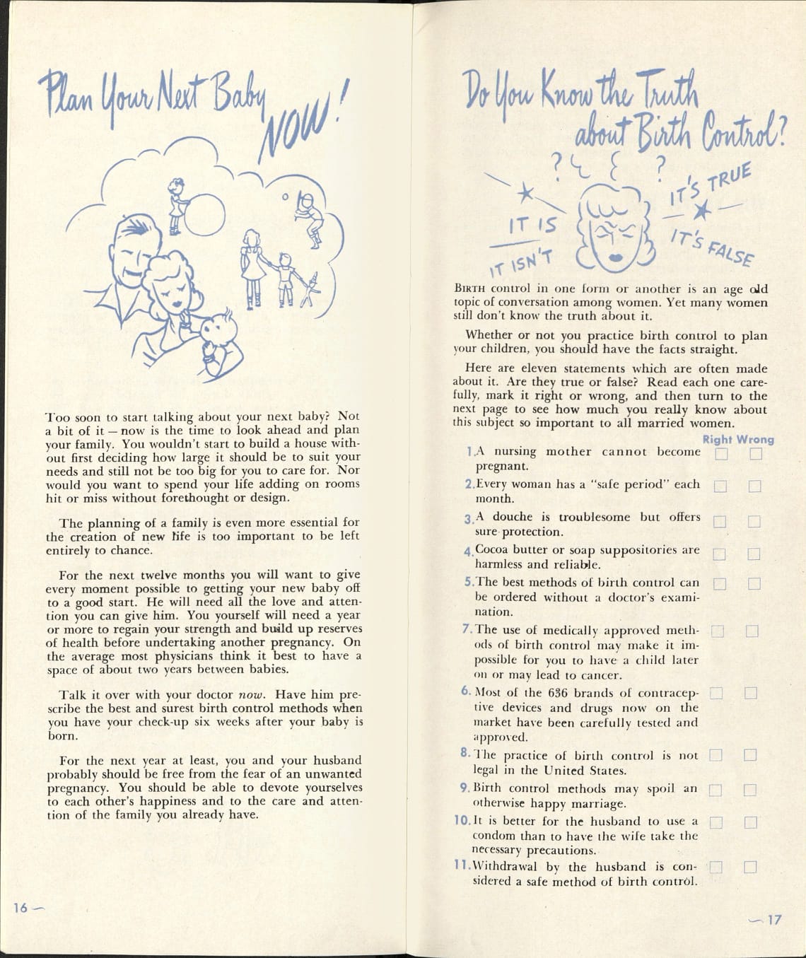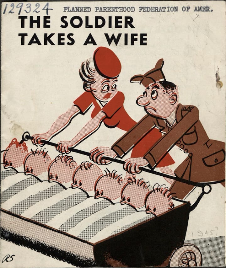 After fighting in World War II, American soldiers coming home faced another duty of sorts to their country: get happily married, have a baby, and nurture a stable, healthy family. Among those encouraging that wartime effort was Planned Parenthood Federation of America (PPFA). The birth control organization published illustrated pamphlets aimed at veterans as well as women that provided firm, authoritative guidance on how to best prepare to start a family. They gave them titles like “The Soldier Takes a Wife” and “For the Man who comes back — and for all his generation,” and included quizzes in their pages such as, “As a prospective mother — what’s your score?”