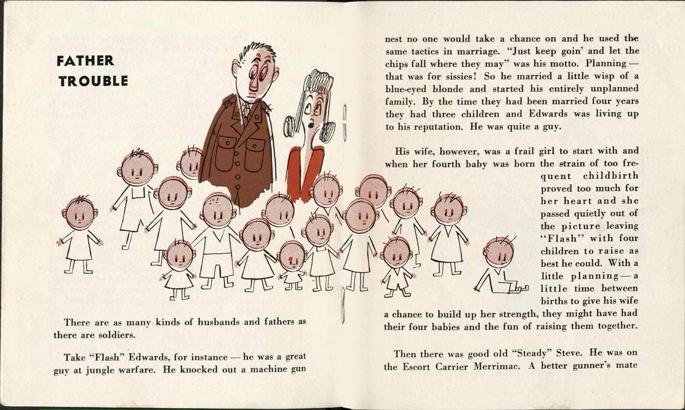 The pamphlets laid out these plans clearly, often accompanied with endearing pictures of a nuclear family. “The soldier takes a wife” features illustrations by cartoonist Ralph Stein of young dads in military uniform, shown holding a bride, pushing a stroller, and attempting to quell a screaming baby. The text, too, can be playful: fictional anecdotes spelling out the woes of one “‘Flash’ Edwards” and one “‘Steady’ Steve” serve as cautions to those who don’t space their children, figure out their budgets, or have a permanent job before starting a family.