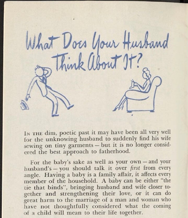 Indeed, one pamphlet describes healthy, safe childbirth as “the most important single job of your life.” It also dictates that women hoping to be mothers first consult their husbands and their doctors, and also maintain a strict daily diet (which includes the note, “three or four cigarettes a day are enough for a pregnant woman”). And there’s the handy tip that a maternity corset or brassier can help you “regain your figure after the baby arrives.”
