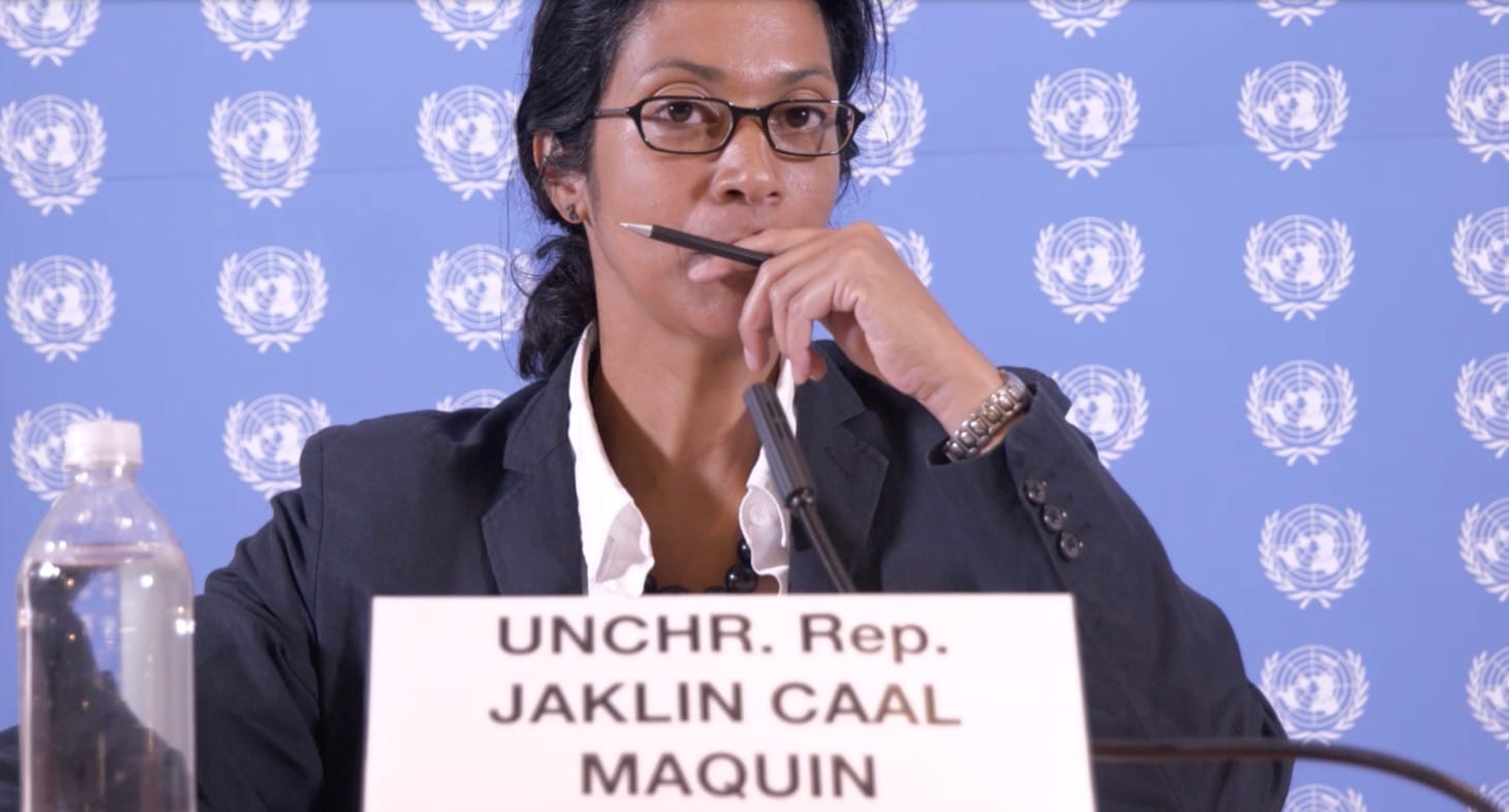 Instagram is a funny world. On August 31, I scrolled through the usual array of selfies, art snaps, fuzzy kittens, and birthday greetings to see artist Alicia Grullon speaking into a mic in front of United-Nations-logoed wallpaper. Given Grullon’s activist and community organizing work, it didn’t seem out of step for her to be testifying before the UN Refugee Agency (UNCHR) but my double take was inspired by the placard in front of her mic which identified her as UNCHR representative Jaklin Caal Maquin.