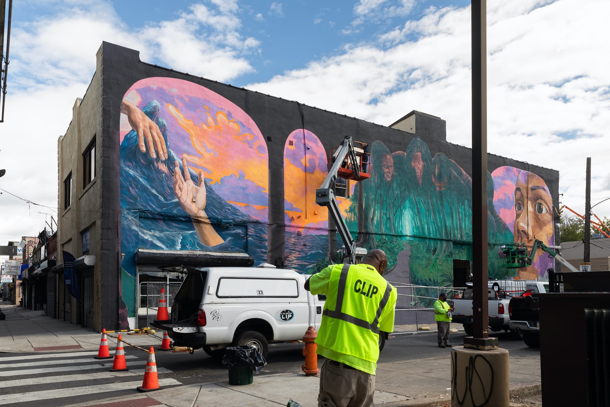 The Jersey City-based artist collaborated with Philadelphia-based Gabe Tiberino on their sweeping two-story work in the North Philly neighborhood, which Tiberino told me is witnessing “probably one of the biggest opioid crises in the country.”